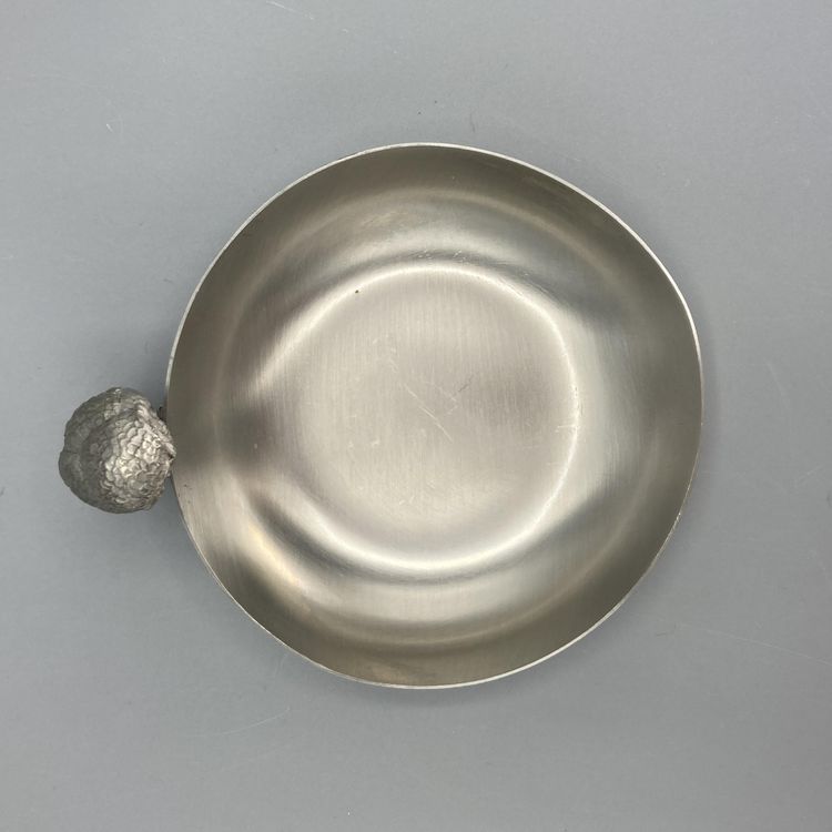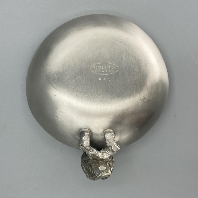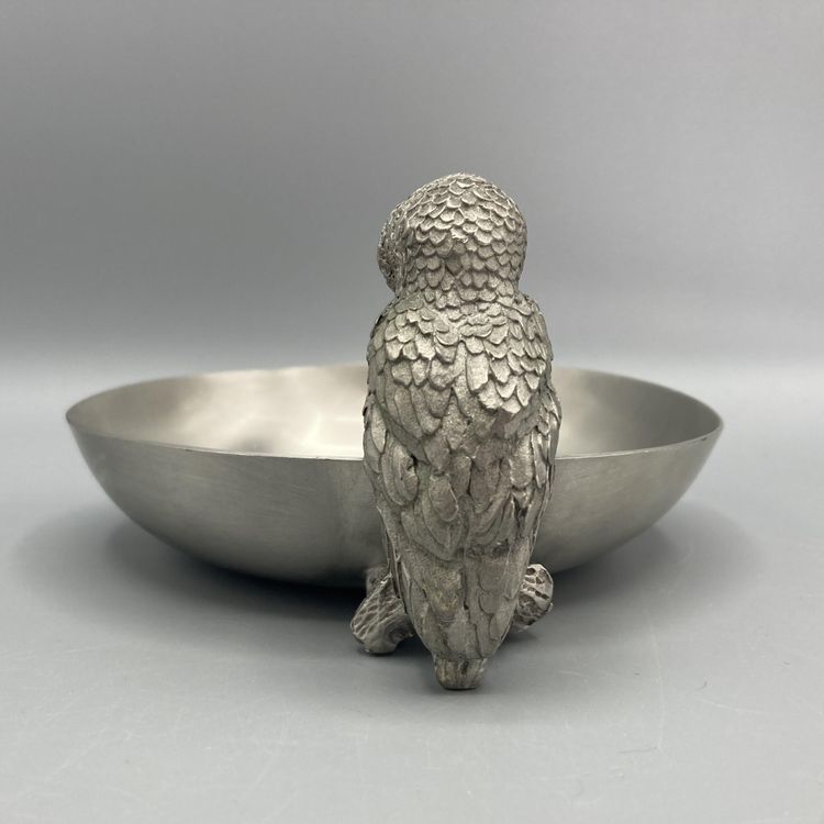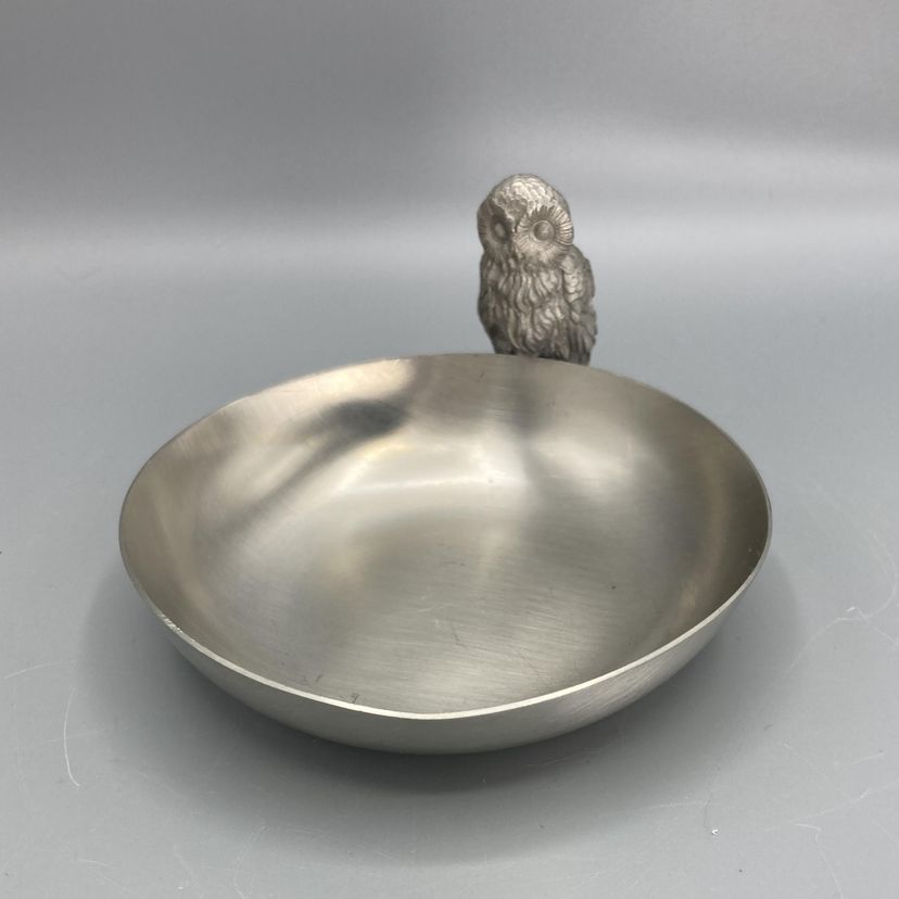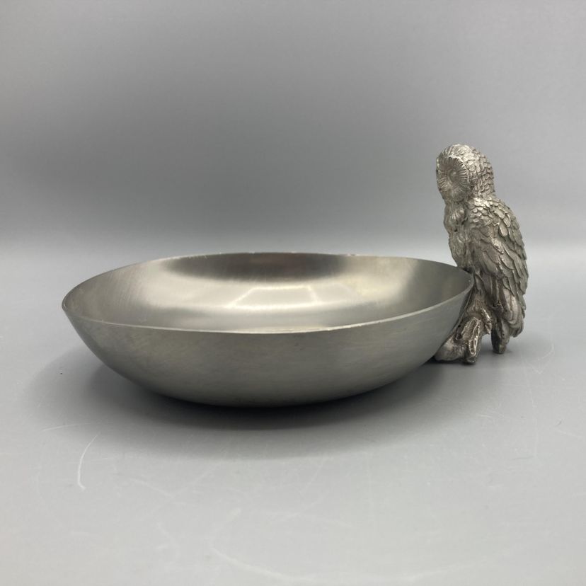 This pewter dish is in good condition. The only thing of note is that the dish isn't perfectly round as pewter is a soft metal. Please see pictures for specific details. This dish measures approximately 5 1/2" tall including the owl x 4 1/2" wide bowl.