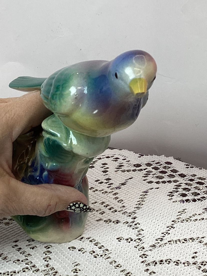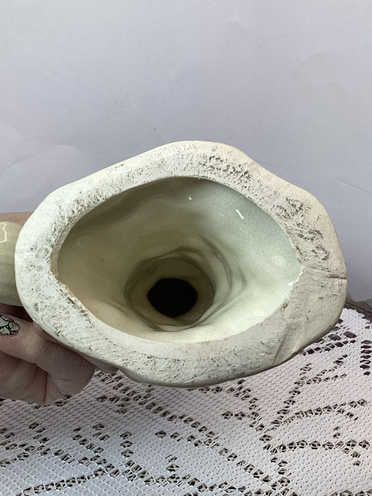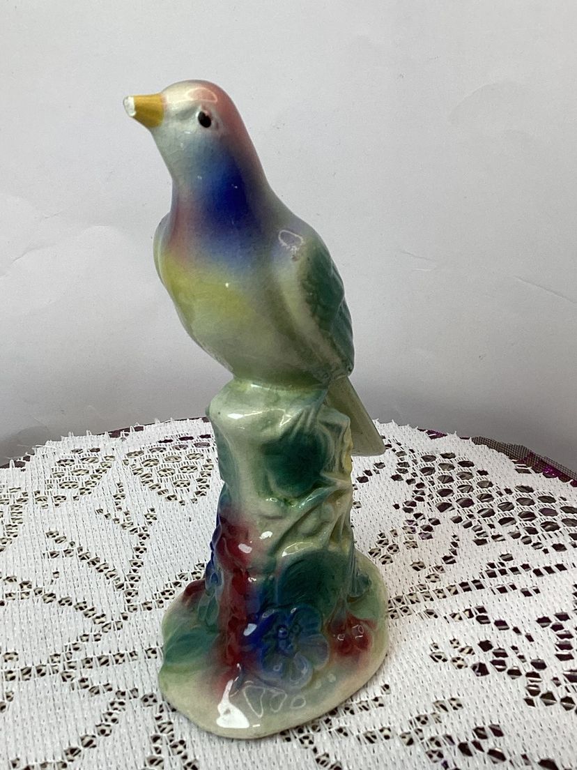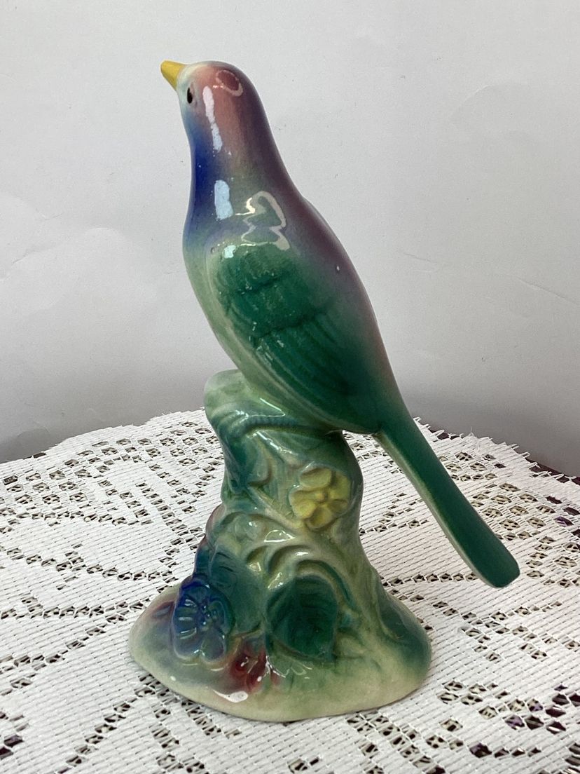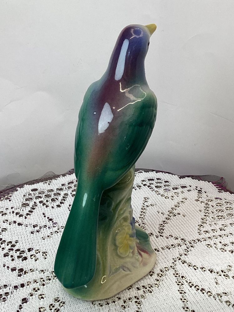 7” tall, 3.5” wide across base. Very good condition the end of the beak is chipped. Thought to be made from a mold created by making a copy of an original, authentic “Flycatcher” by Royal Copley.