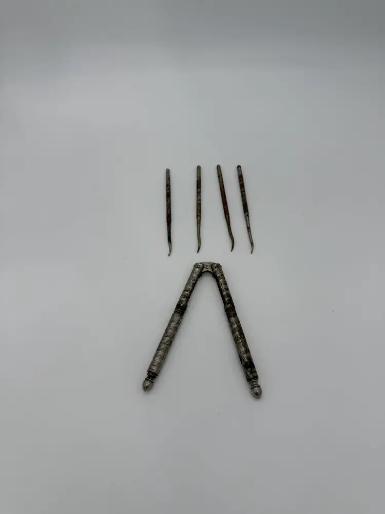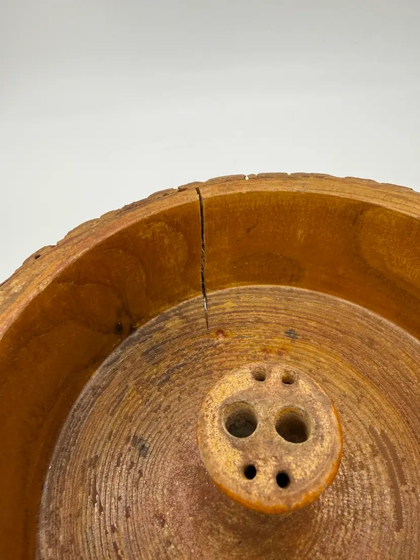 The bowl has a crack due to dryness over the years. Mineral oil works really well with wood conditioning, If desired , also can be closed with wood putty “If desired.” The HMQ “ Henry Marcus Quackenbush” - cracking tools are also not in the best condition, they can be refurbished if desired or kept as is for its aged appearance. See pictures for condition details.