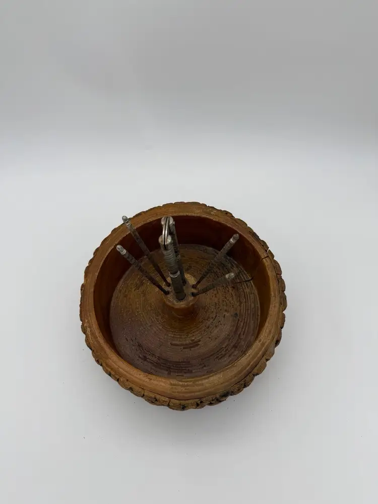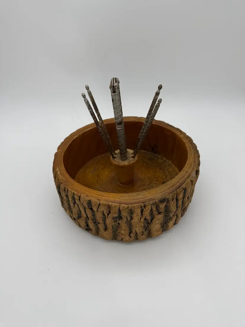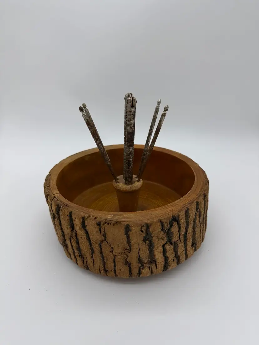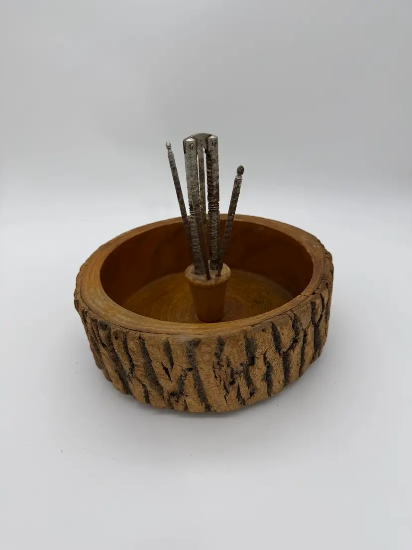 The Vintage Retro Wooden Nut Bowl With Bark Edge and HMQ Nut Cracking Tools 6pc Set is a charming addition to any kitchen or dining space. Made from wood, this original comes equipped with its vintage metal tools, this set features a vintage/retro style and a brown color that adds a touch of nostalgia. The set includes 6 pieces, including a nut bowl with a bark edge, making it both practical and aesthetically pleasing. Weighing at 2 lbs and 4.5 oz.
