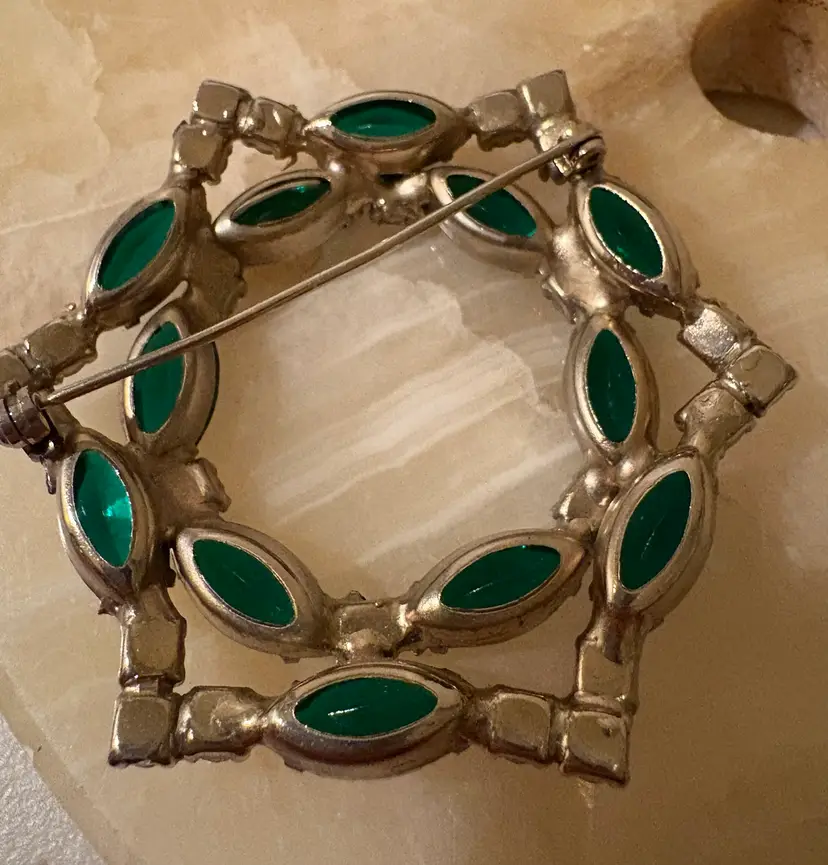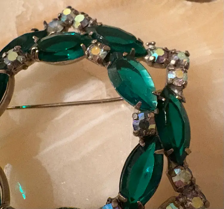 Vintage emerald green rhinestone holiday brooch. 2 1/2” across