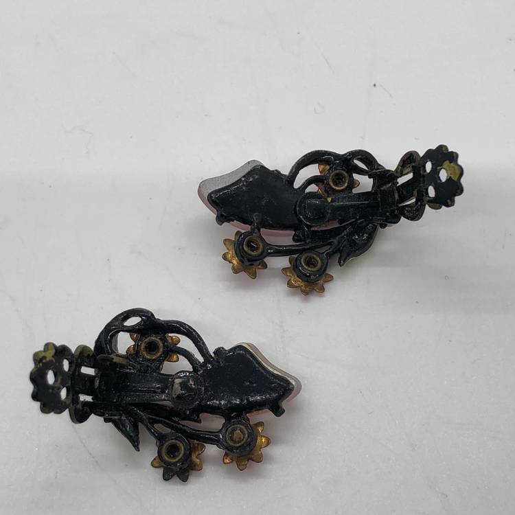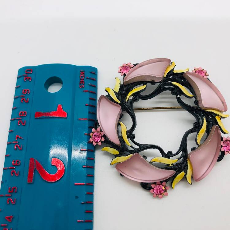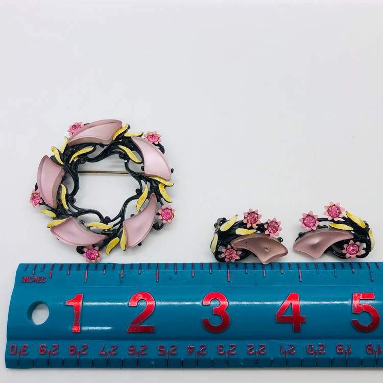 This Beautiful Brooch and Earring set is full of color. Set on a black enamel background are pink Rhinestone flowers and yellow leaves. It comes with clip on matching earrings. All in great working order. There is very slight black enamel loss due to natural age. Please check photos. Thank you.