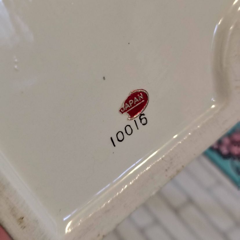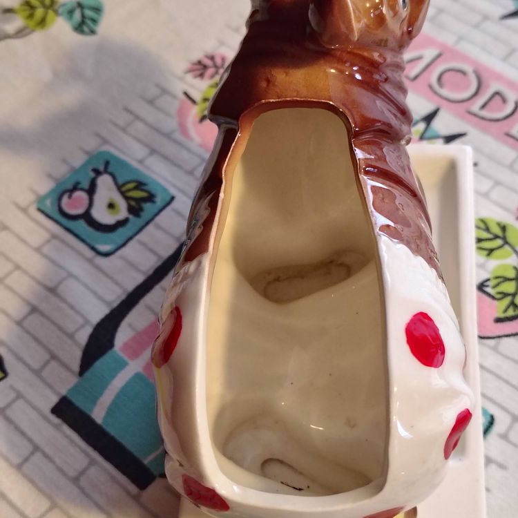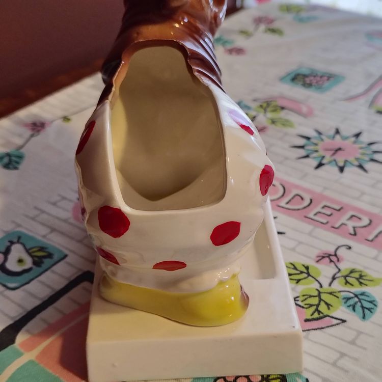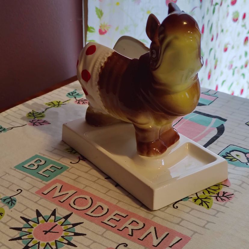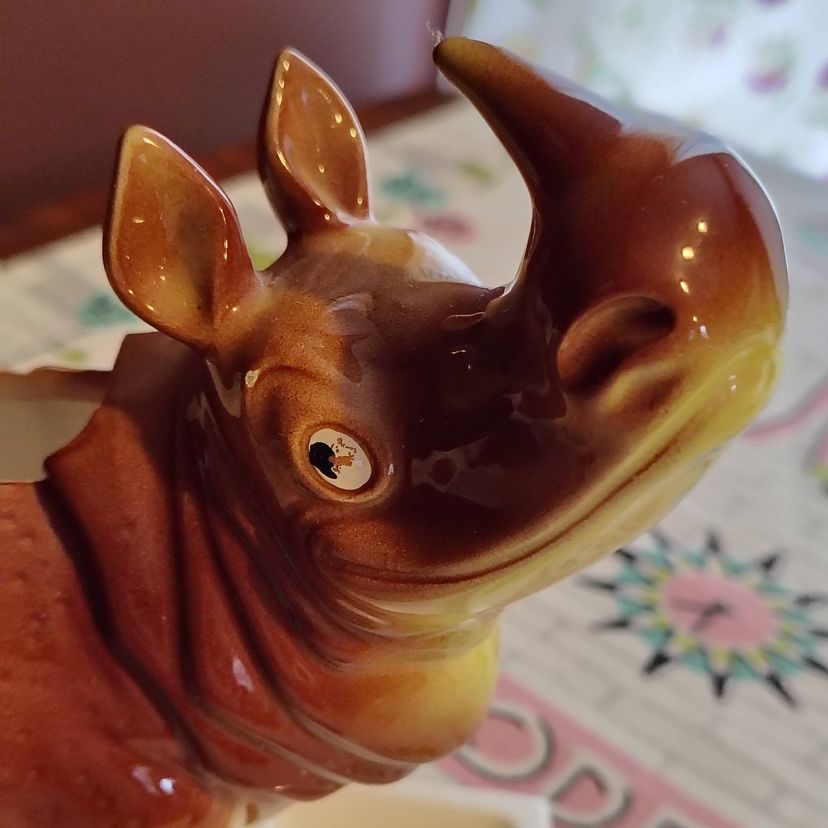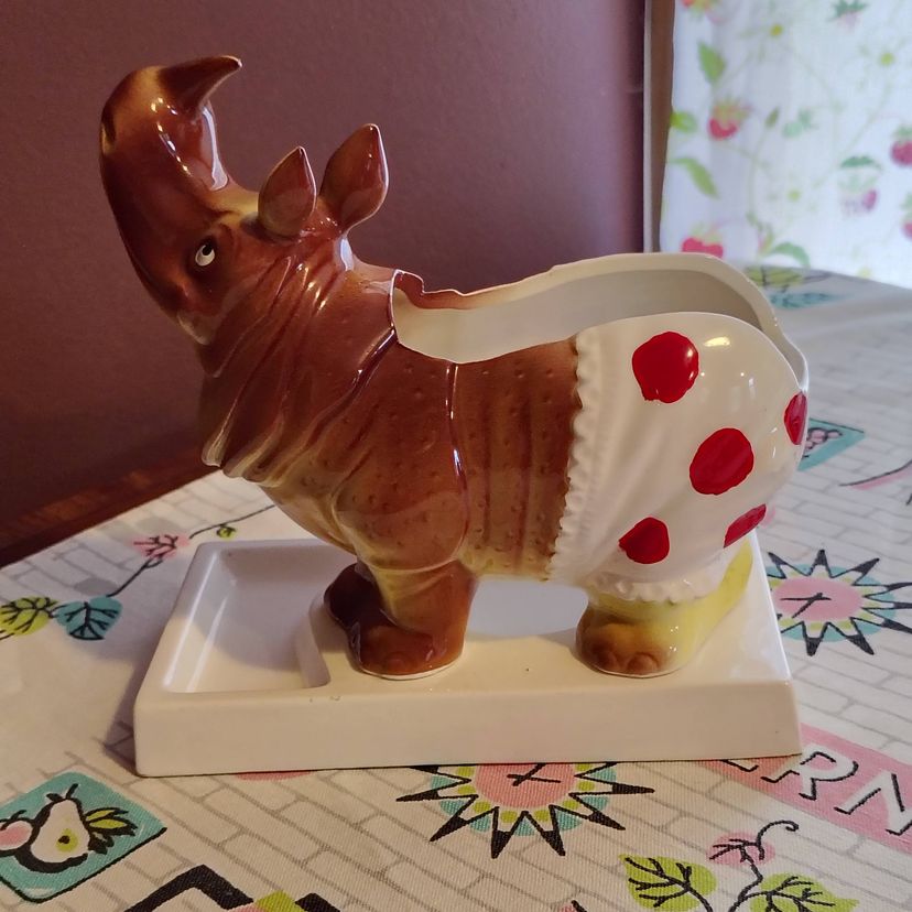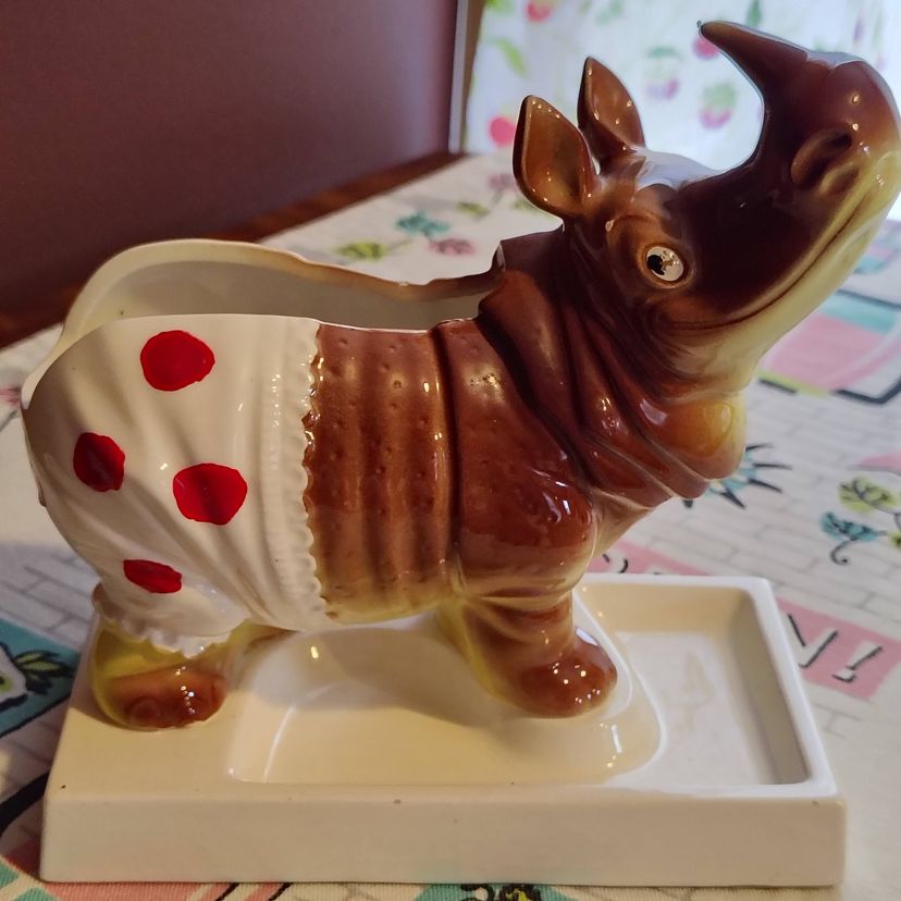 This is a vintage dresser caddy, shaped like a young rhino! Made in Japan, probably during the 1960s, this ceramic valet has it all. A place for your wallet, a little spot for your keys or change, and a whole load of personality! Too cute! P. S. He'd also make a fun planter... if you dare! Condition: This piece is in Very Good shape! Our bouncing baby boy does not have any serious damage, just a little fleck of missing glaze above his eye and a flake of cold paint missing underneath. His base does have a chip underneath - A large but thin piece near one of the corners was flaked off. He still sits evenly and the chip isn't really visible from above. Lucky for us! Size: He measures 6" long, 3" across, and sits 6½" tall.