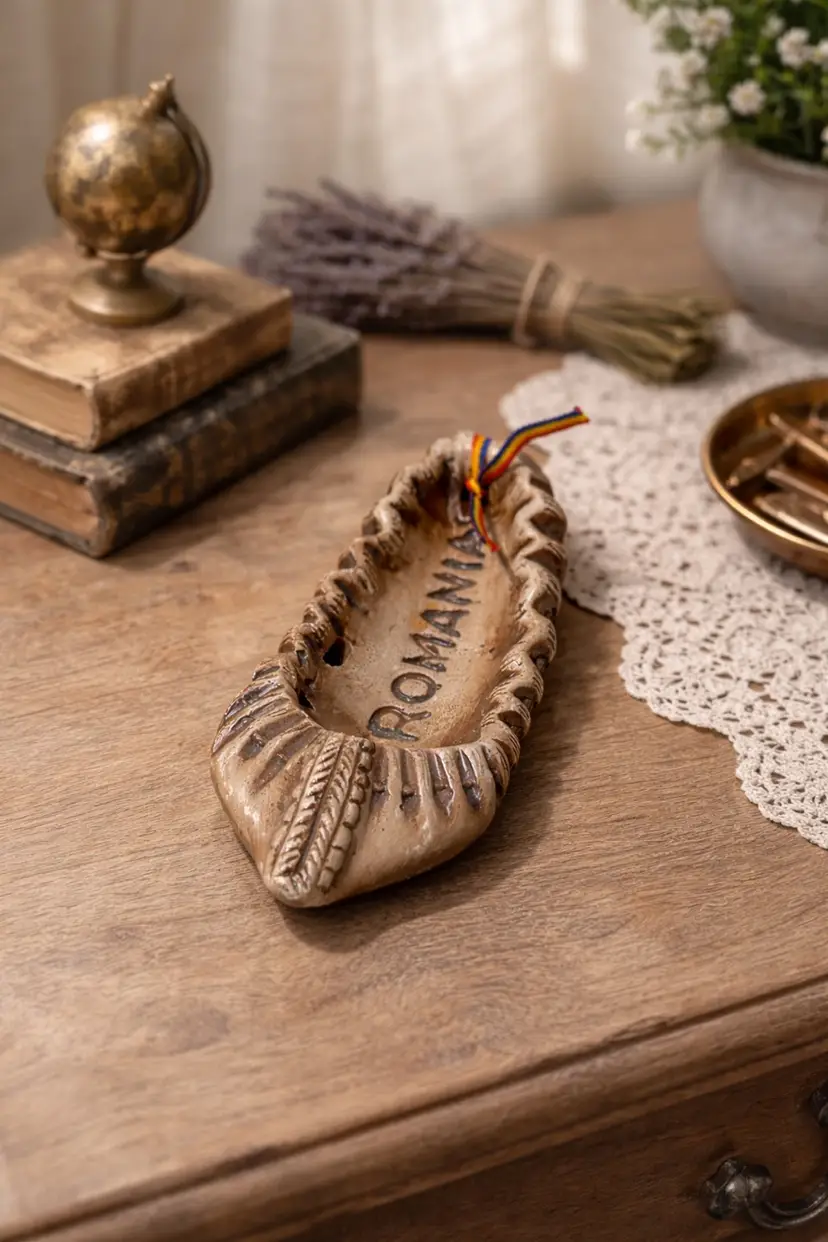 A wandering fairy named Dorina—whose name comes from the Romanian word dor, meaning a longing for home—shaped this small ceramic opincă as a keepsake. Though it cannot walk, it holds what the heart carries.