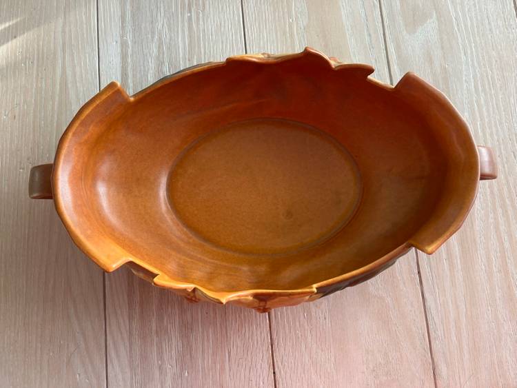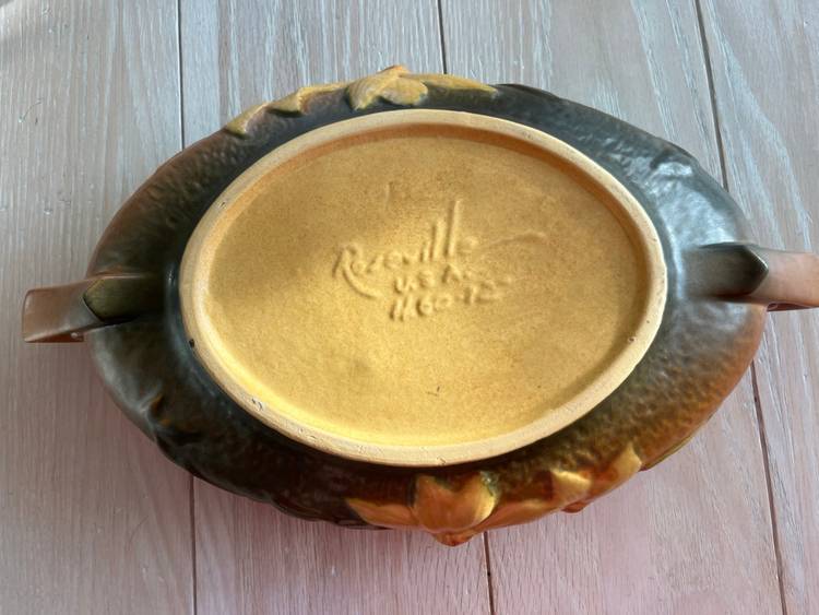 This vintage Roseville Art Pottery Clematis large oval console bowl is a beautiful addition to any home decor. Made of high-quality terracotta, the bowl features a timeless vintage design with a floral pattern that adds a touch of elegance to any room. The oval shape and art pottery production style make it a unique and eye-catching piece that is sure to be a conversation starter in any space. Perfect for displaying fruits, nuts, or potpourri, this console bowl is both functional and stylish.