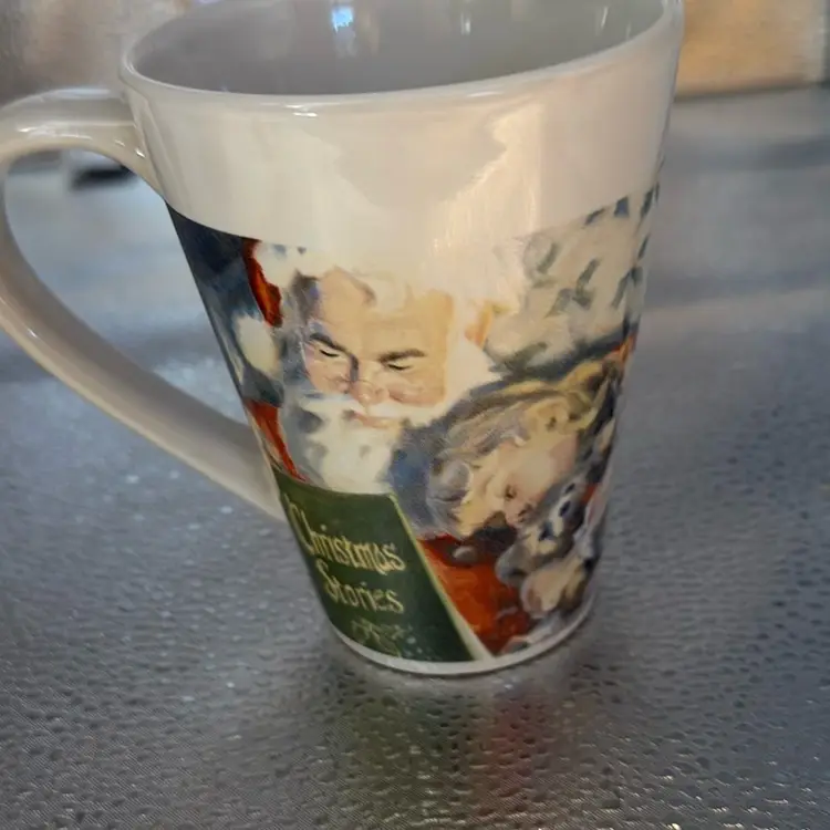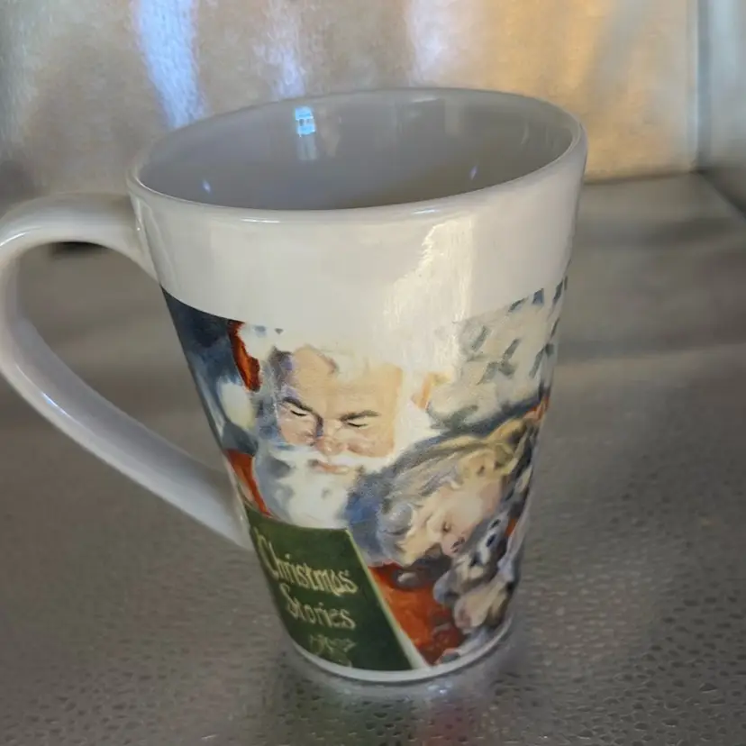 This mug is 4.5 inches tall. It’s great for Christmas. Santa is reading to a sleeping child.