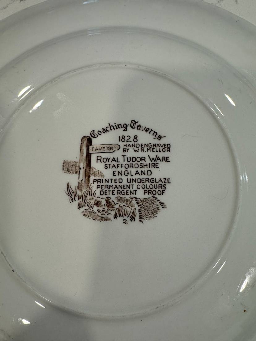 This decorative plate features a classic brown and white transferware design with hand painted pink and white floral accents. This charming plate depicts a lively coaching tavern scene, complete with horse-drawn carriages and figures. It makes a beautiful display piece for collectors of historical or country-style decor. In excellent pre-owned condition, with no chips, cracks, or significant wear.