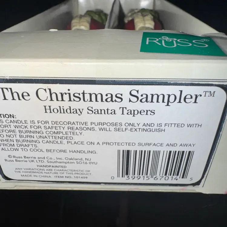 The Vintage Russ Berrie & Company Holiday Candles 2 Santa Claus Taper Candles are a charming addition to any Christmas decor. Made of wax and measuring 9 inches in length and 10 inches in height, these candles feature a multicolor design with Santa Claus depicted in a traditional Christmas setting. Handmade in China, these candles come boxed and are perfect for creating a festive ambiance during the holiday season.