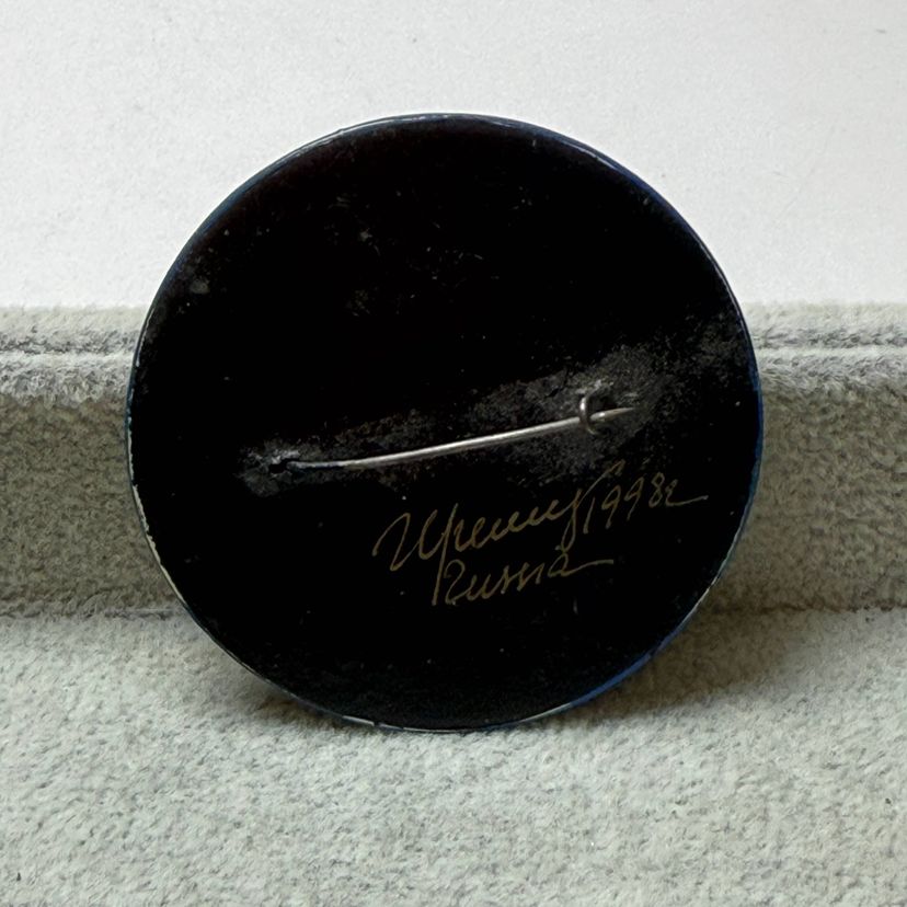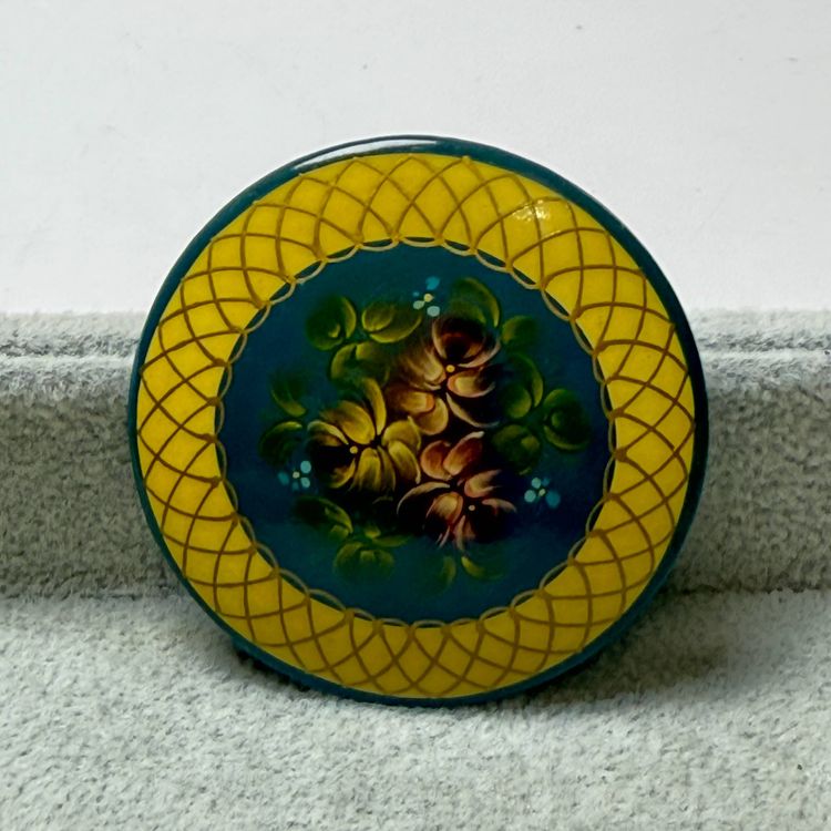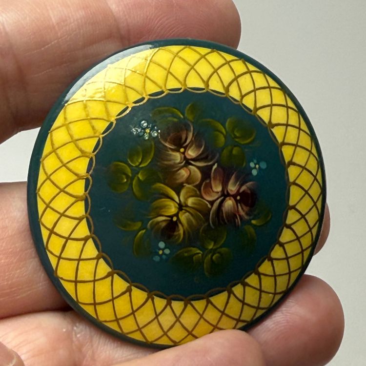 Vintage Russian Lacquer Wood Brooch Folk Art Miniature Yellow Floral Filigree Signed 1998. Measures 2" diameter. Great condition with little to no wear. Signed on the back.