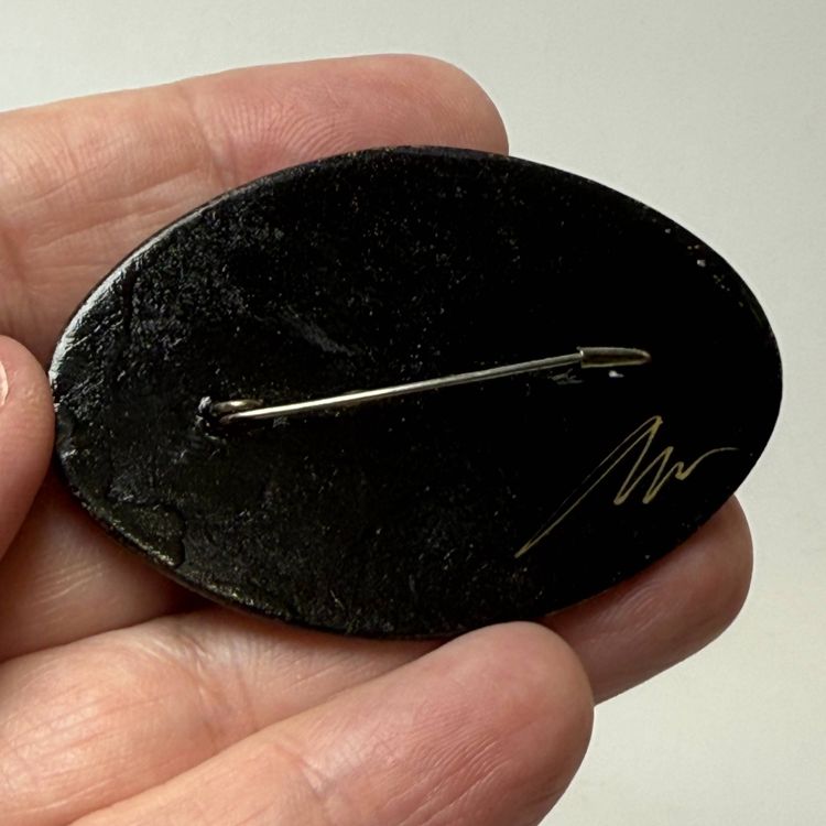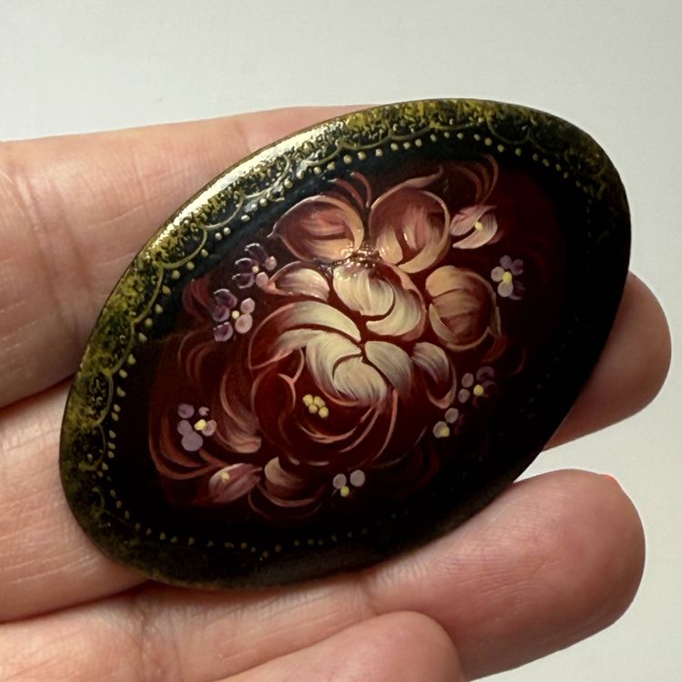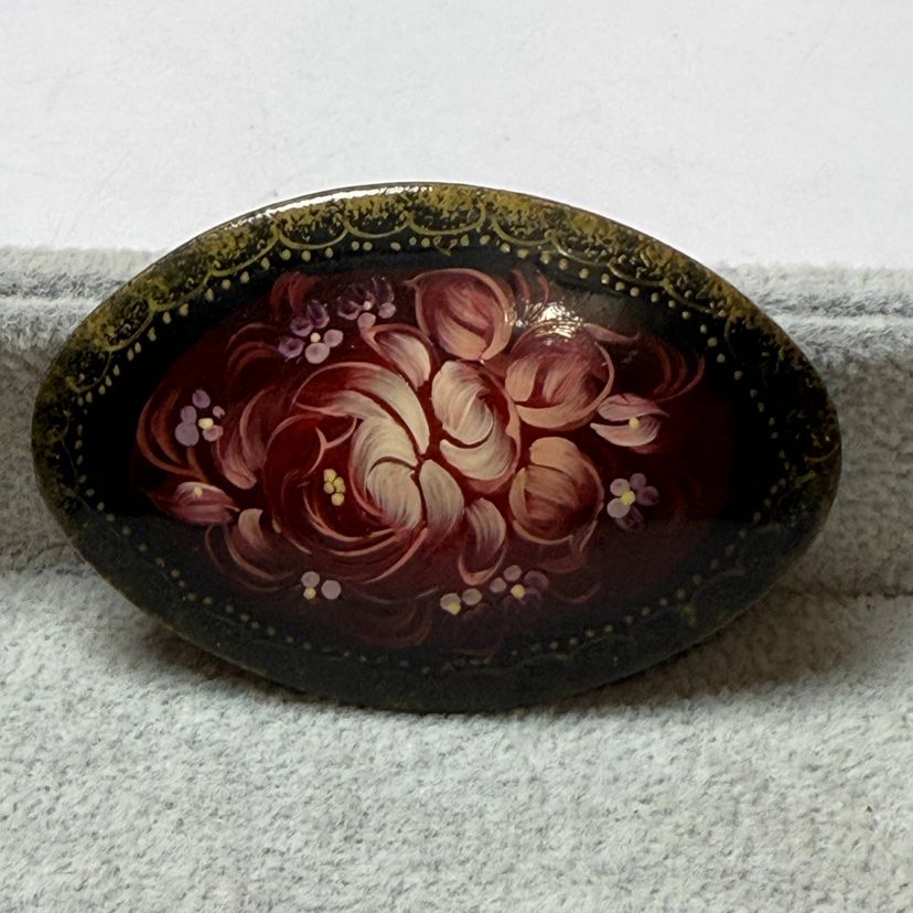 Vintage Russian Lacquer Wood Brooch Folk Art Miniature Purple Floral Signed