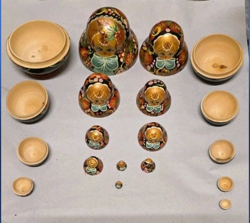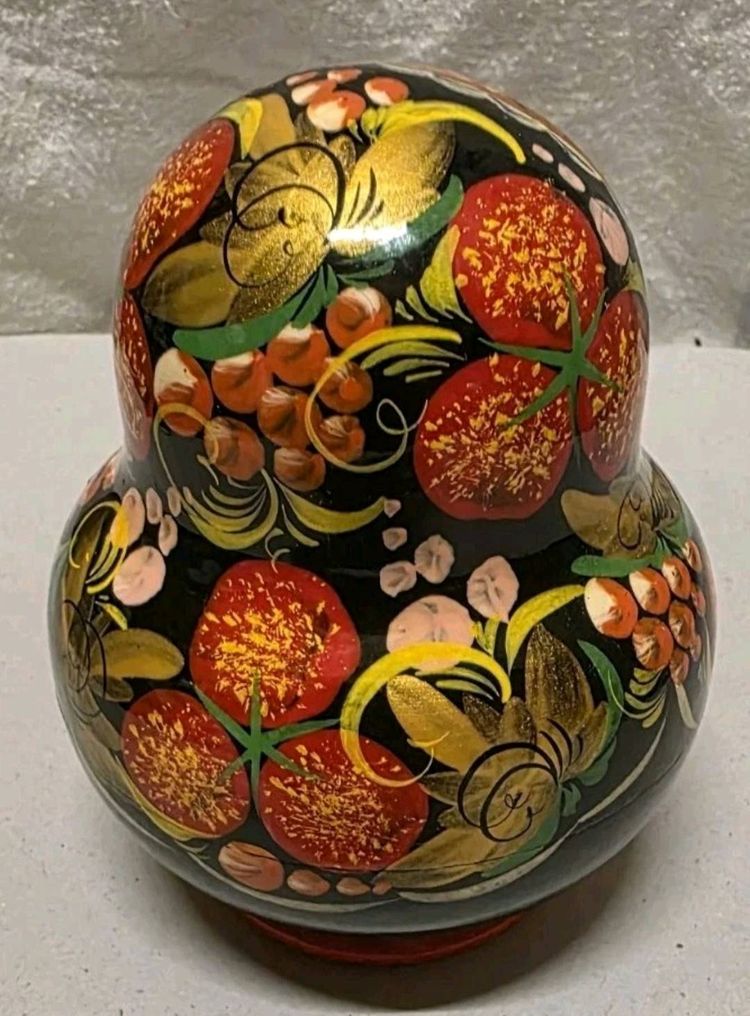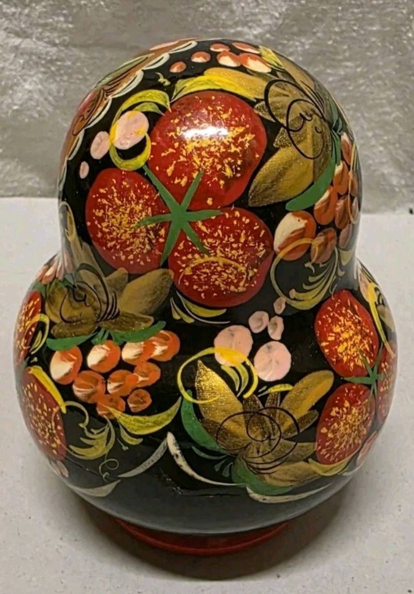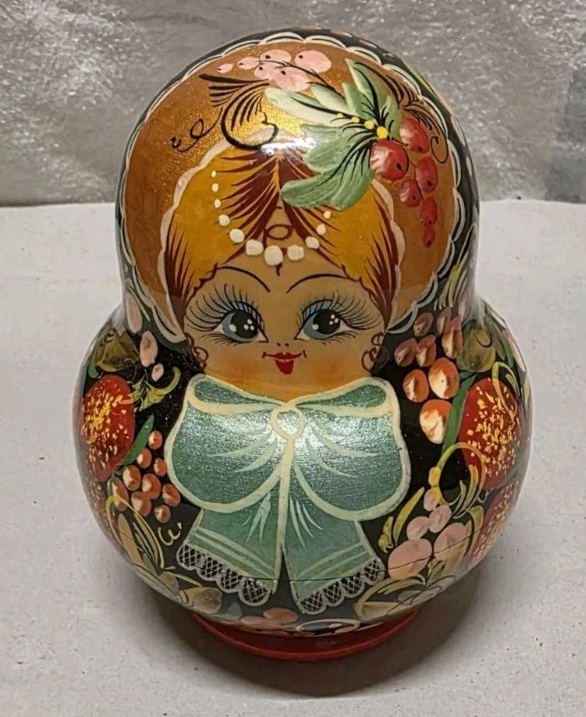 This product is a set of 10 traditional Russian Matroyshka nesting dolls, crafted from wood with intricate hand-painted designs. The dolls are authentically signed by the artist, making them a special piece of folk art from 1998. With their rich cultural significance and handmade craftsmanship, this collection would be a unique and cherished addition to any collector's display. The intricate details and Russian cultural influence make these dolls a standout decorative item for enthusiasts of folk art and cultural artifacts.