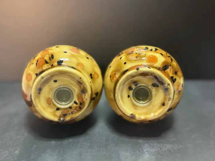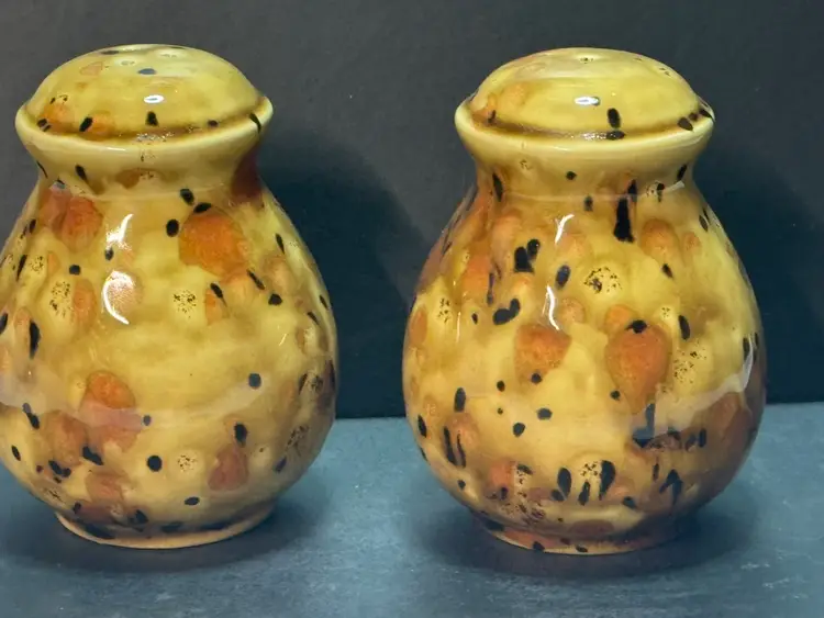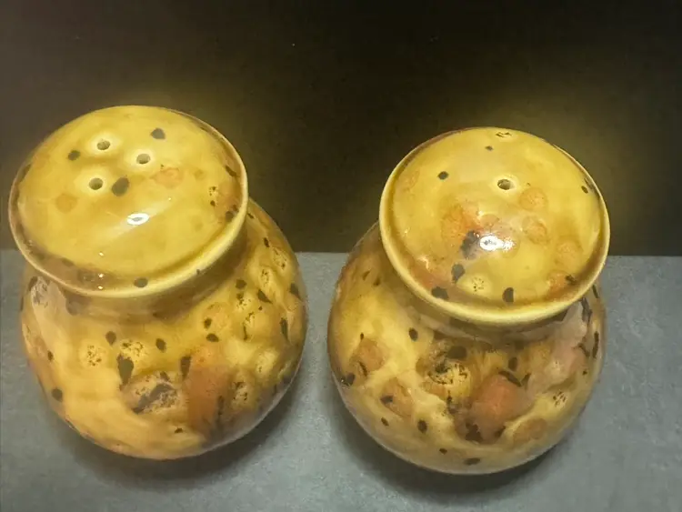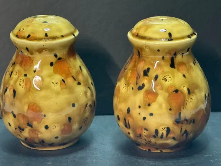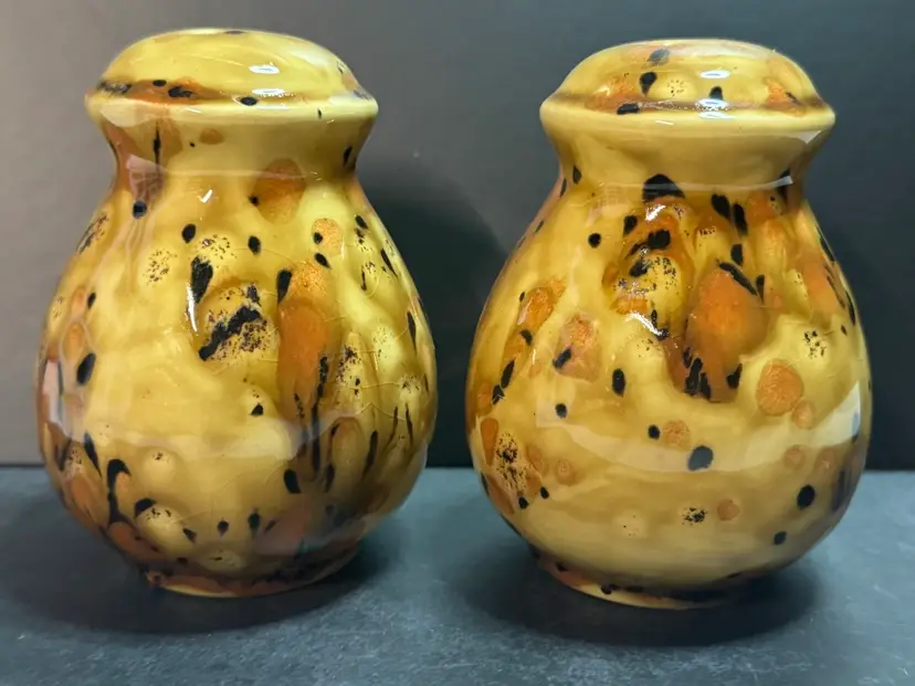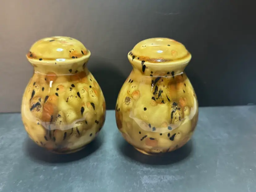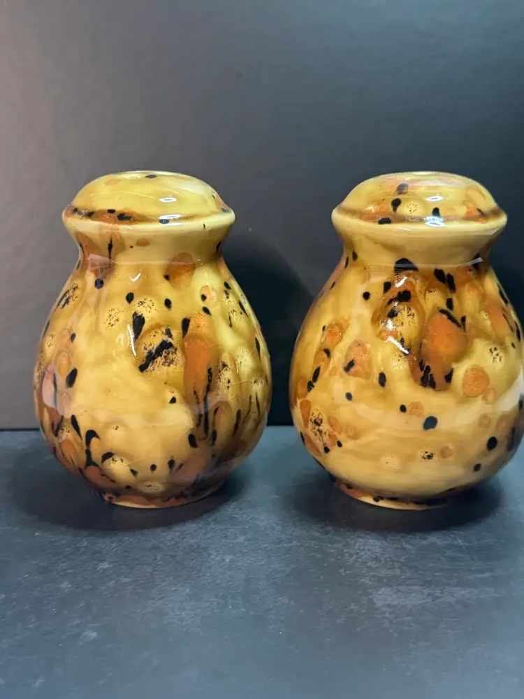 These are ceramic salt and pepper shakers with a unique tan/beige and brown spotted glaze, featuring a textured "blob" of drizzled ceramic in an abstract design. They are likely a collectible or vintage item.
