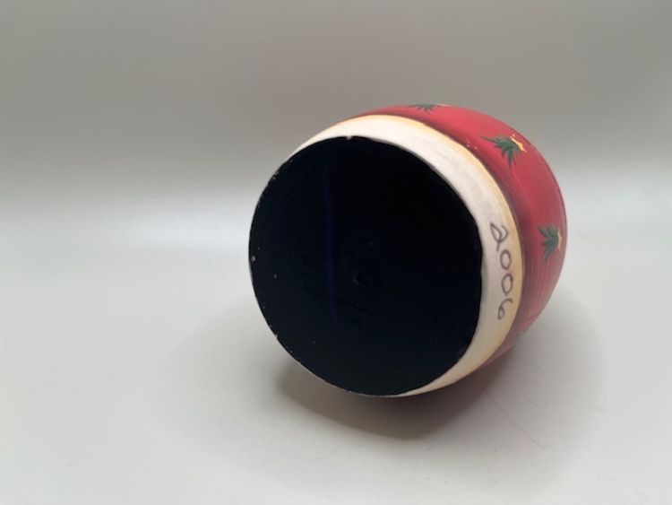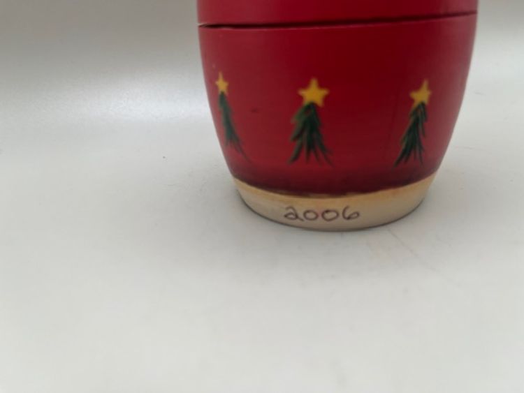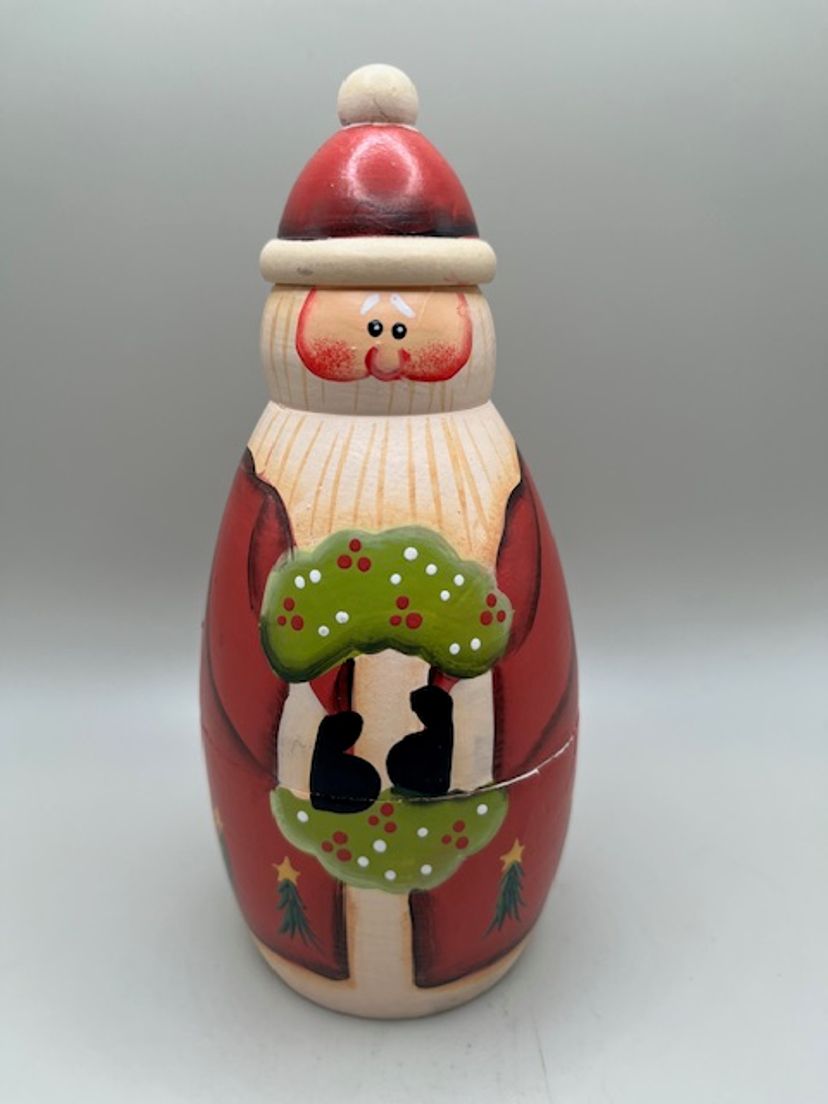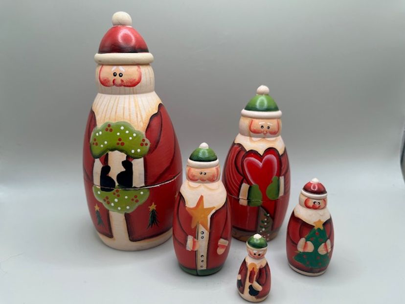 Celebrate the holiday season with these adorable Santa nesting dolls. Hand painted with intricate detail, this set includes five pieces of varying sizes. This set is previously owned and so naturally has slight wear and imperfections. Largest measures 6.25 inches tall.