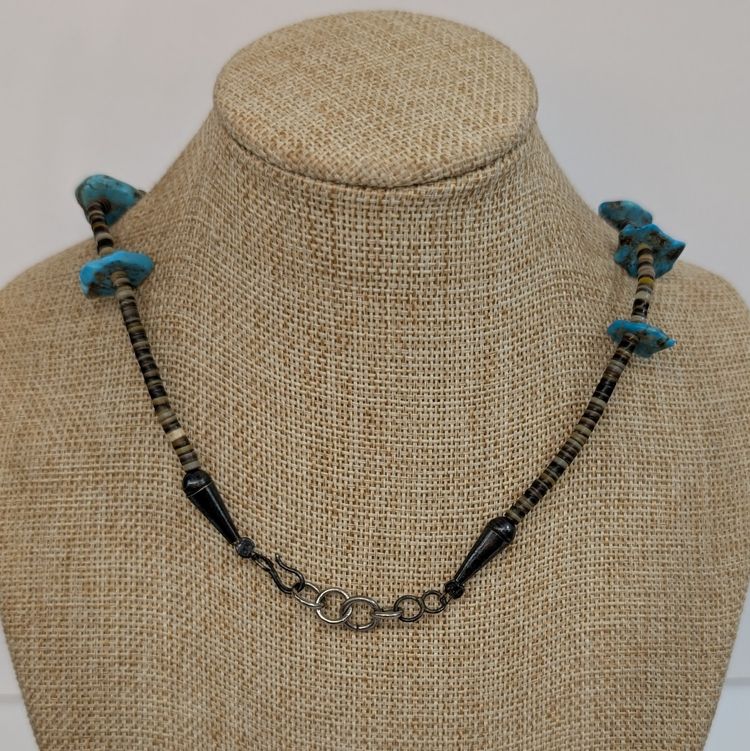 Beautiful mix of dark brown and cream heishi shell beads and turquoise tab beads. The ends are sterling but 4 jump rings have been added as an extender and they are not sterling. In nice, used condition. Measurements ~ 16.25 to 17"