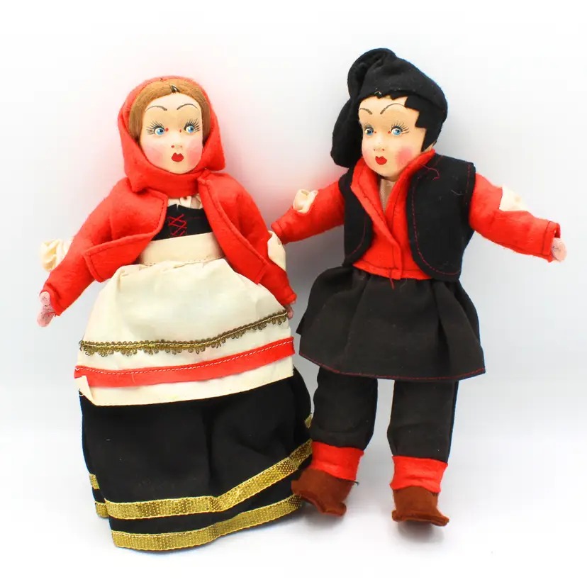 • Authentic mid-century Sardinian folk dolls • 1950s Italian souvenir couple • Hand-painted faces with bright details • Traditional felt clothing and shoes • Moveable arms & legs, cloth bodies • Girl with apron, boy in traditional vest & cap • Matching pair, approx. 9 inches tall • Lovely display set for doll or travel collectors • Wonderful world culture / ethnic costume dolls