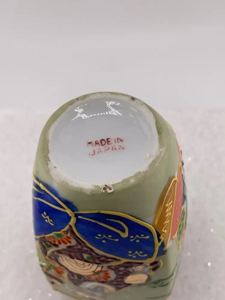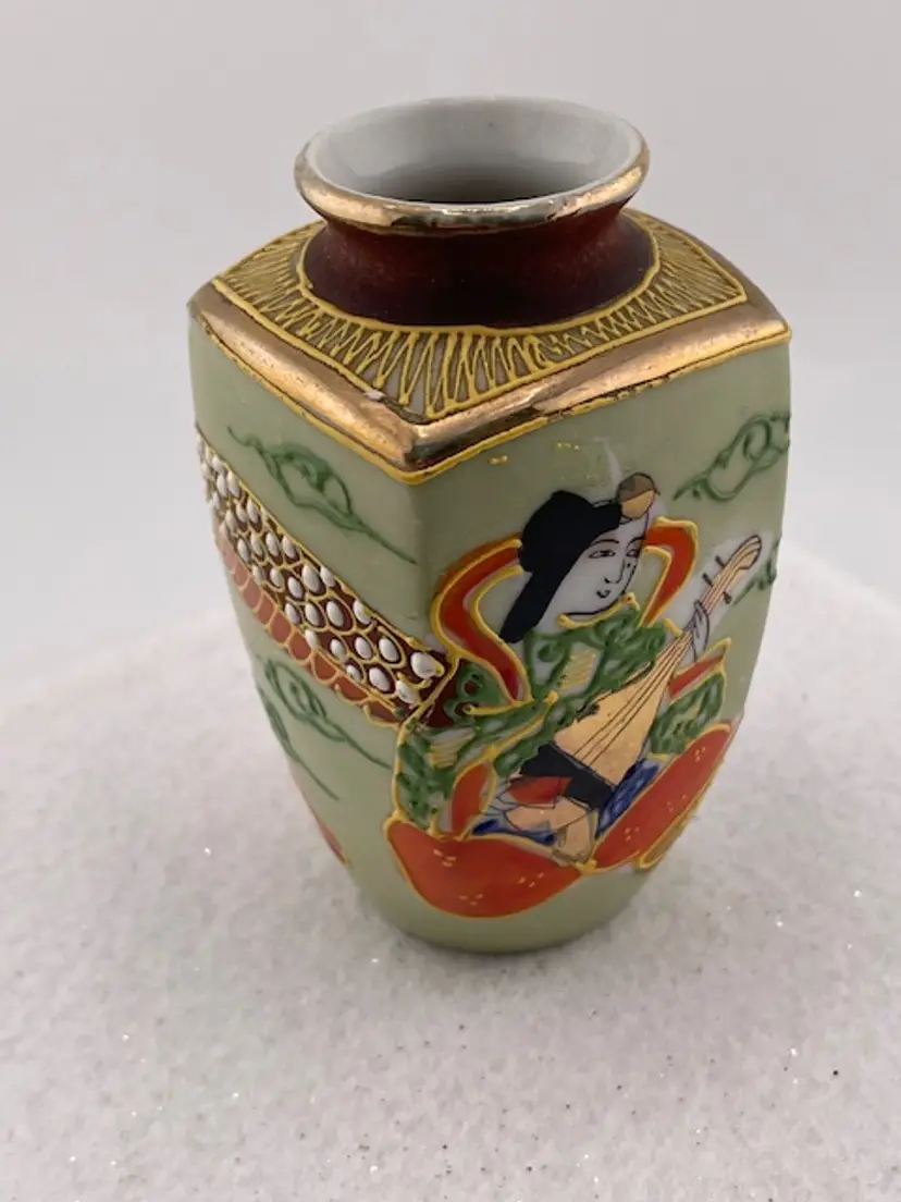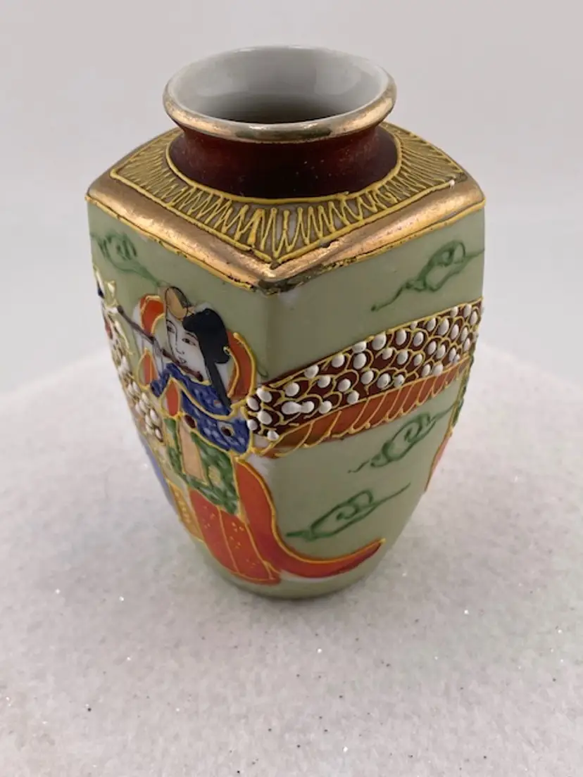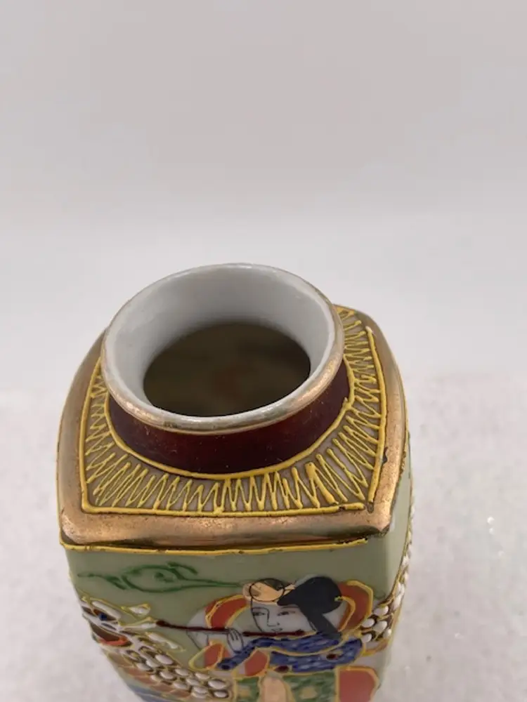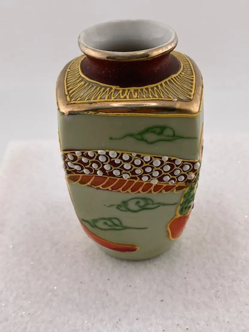 This beautiful detailed vase was made in Japan. It has a textured surface with a dragon. It is trimmed in gold gilt. It is in good condition with no chips or cracks.