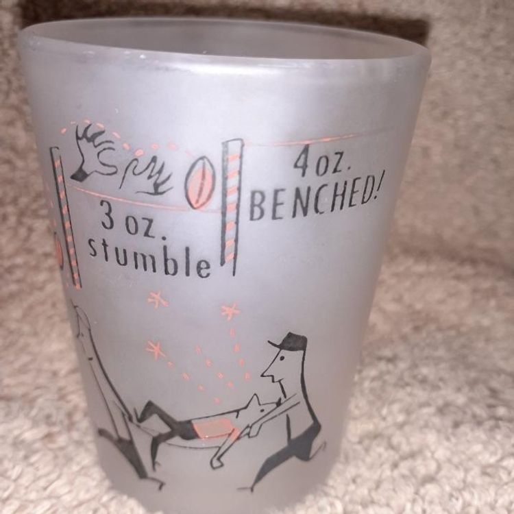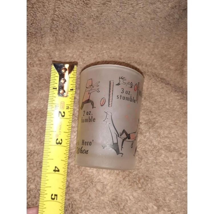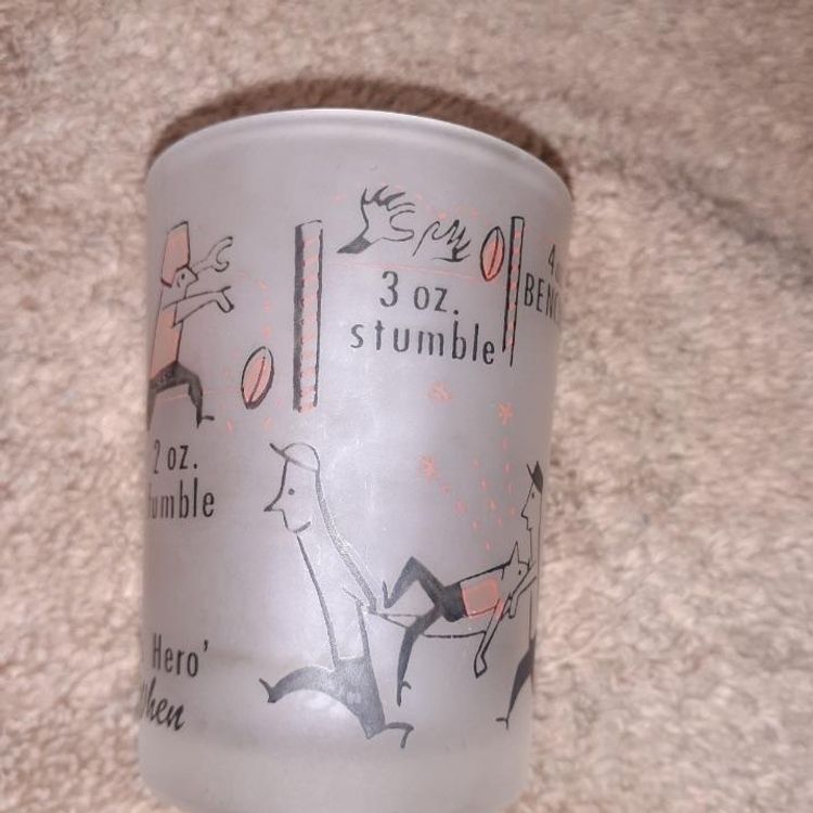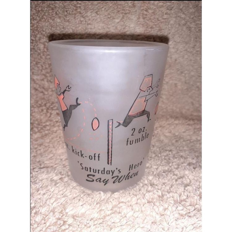 Vintage Anchor Hocking Saturday's Heroes say when shot glass. Cute 1950s retro barware frosted glass 0 oz Waterboy 1 oz Kickoff 2 oz Fumble 3 oz Stumble 4 ounces Benched! Nice black and reddish pink Football Graphics no chips cracks crazing Anchor Hocking Maker's Mark on bottom Rare design all items from a smoke-free home with pets experienced breakable shipper Perfect addition to your mid-century modern Don Draper wet bar