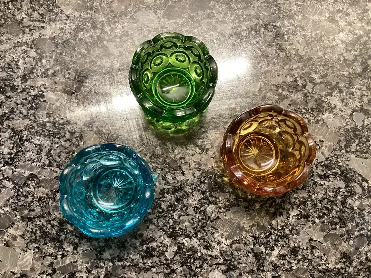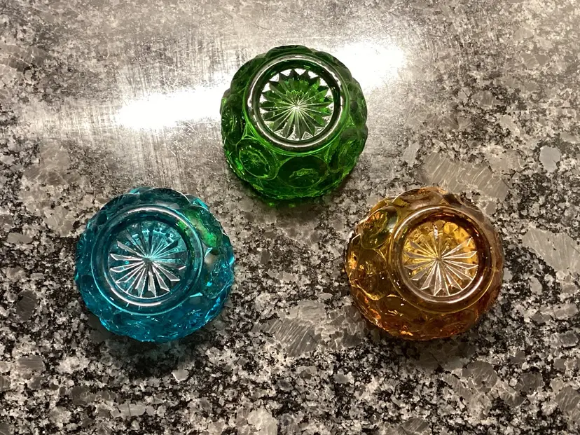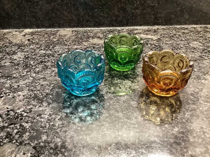 This is a set of three moon and stars individual salt containers. No condition issues noted. Two of the three do glow.