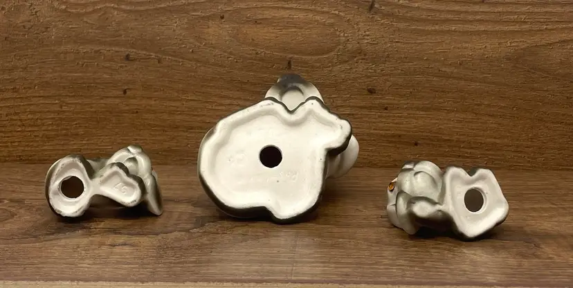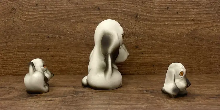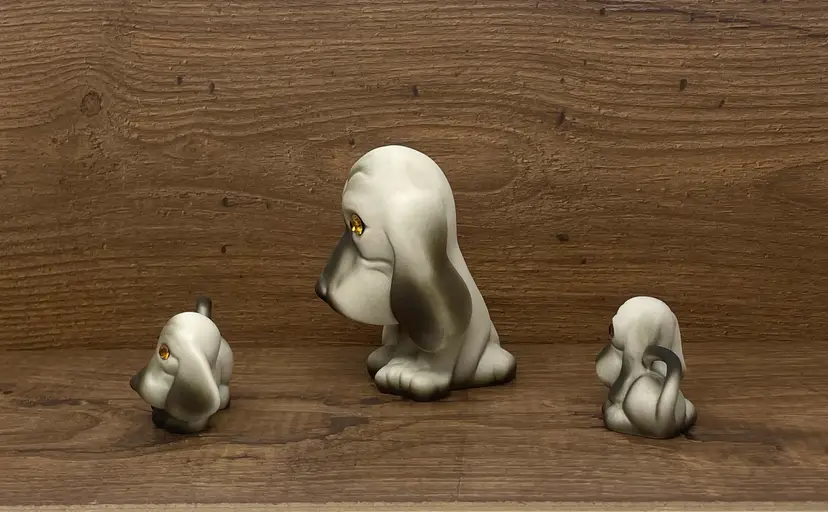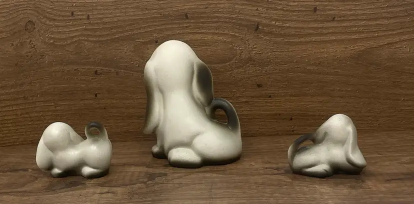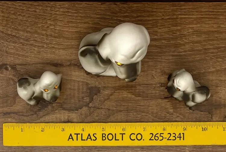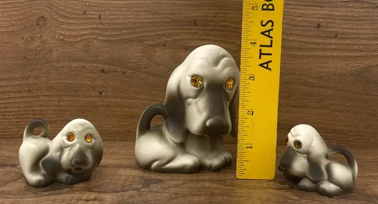 A set of 3 Roselane houses dog figurines. They all have yellow rhinestones eyes. The set includes one larger, sitting dog and 2 small dogs. The small dogs are crouching/lying on their bellies. Each figurine is excellent with no noted issues. Please review all photos prior to purchase.