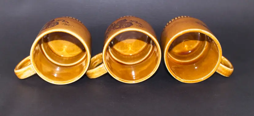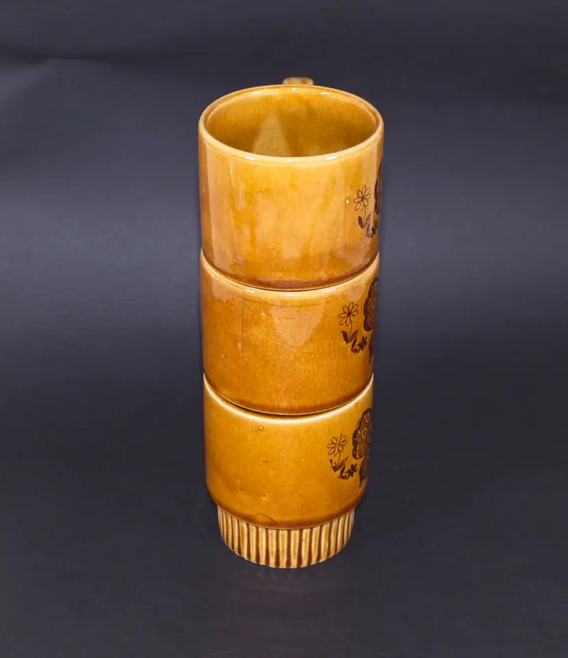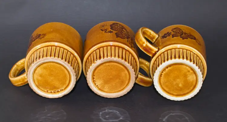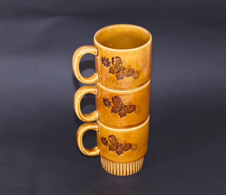 Vintage Set of 3 Stackable Mugs Cups Porcelain Japan Butterflies 6 oz. There is some crazing, but mugs are structurally sound. Each mug measures 3" wide x 4" deep x 3.5" tall