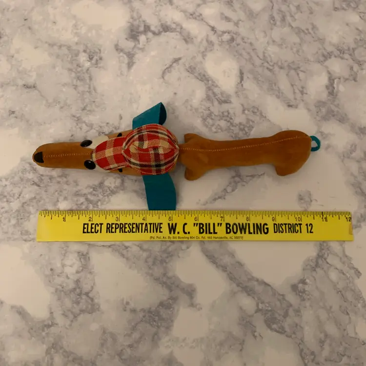 This long Sherlock Holmes Plush Weiner Dog is investigating what Vamp is all about. He has solved the mystery of the vintage lovers and is ready for a new home. He is made of a velvety fabric and is in great condition except for a small light spot on his back. He has no tag so I do not know if he is a Dream Pet. Est era- 1960's maybe early 70's.
