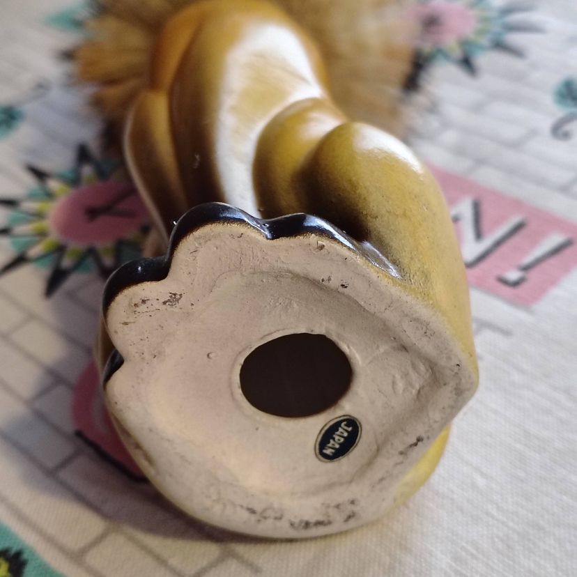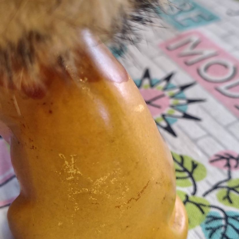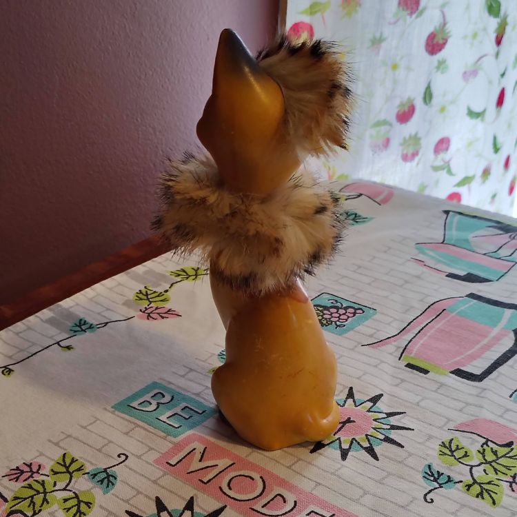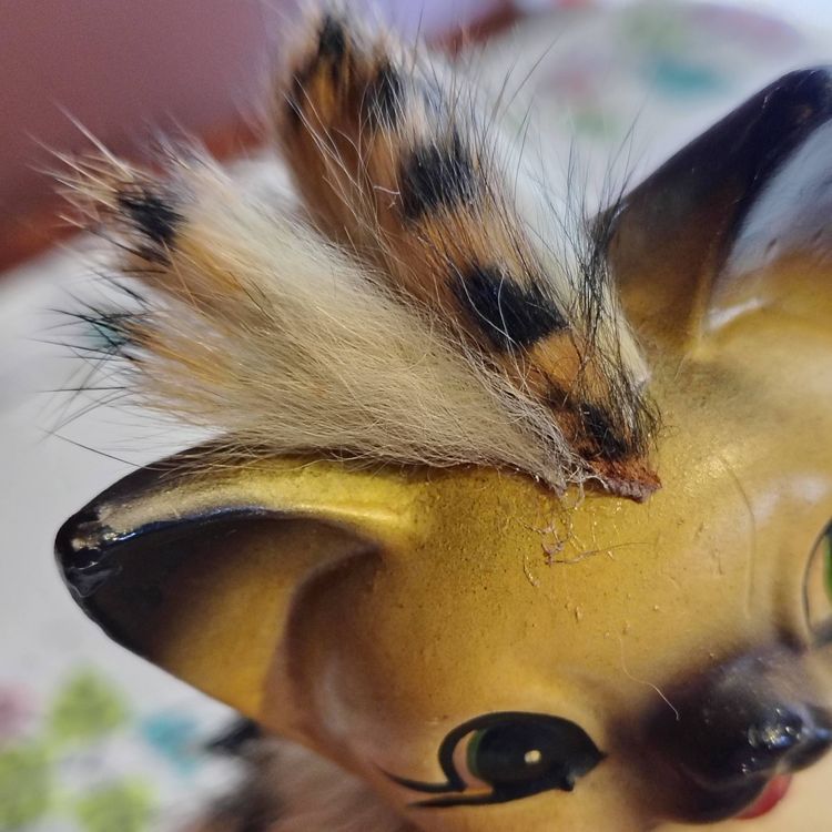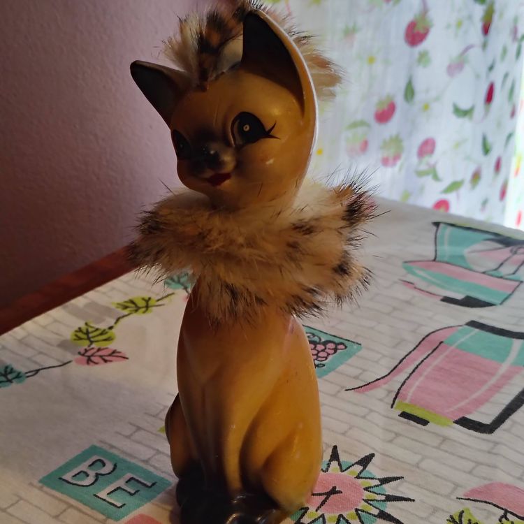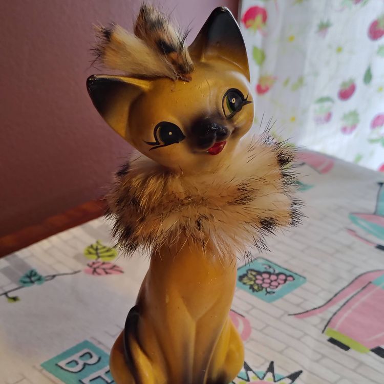 This is a vintage cat figurine with over the top style! Made in Japan, probably during the 1960s, this pretty kitty has got it goin' ON. That long neck, those big eyelashes, and that superfluff says it all. Siamese cats were in, and she is just quintessentially mid-century kitschy! Condition: This kitty is in Very Good shape! While she does not have any chips or cracks, she is starting to show her age just a touch. Her body color is a type of cold paint, and there is minor scuffing up and down her back, plus her paint was unevenly applied to start with. She is shedding a bit of fur. I think she originally would have had a bit more on her head perhaps? She certainly left a little fluff on me when I handled her for her photoshoot, but I didn't feel any loose clumps. I do think her fur may have originally been a bit brighter orange, although I can't be certain. She certainly still has the look though! Size: She measures 2¼" across, is 2½" wide, and sits 7¼" tall. Striking!