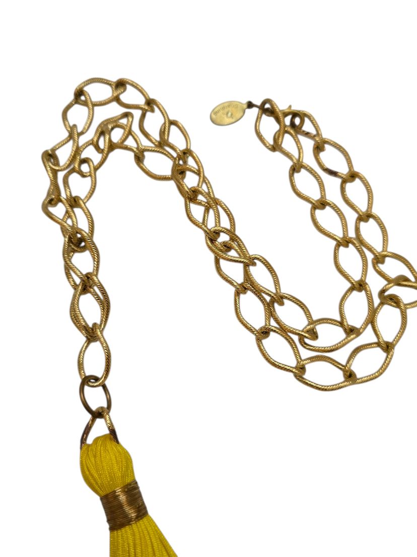 Vintage Signed Bee Charming NOS Yellow Silk Cord Huge Tassel On Textured Link Chain Necklace (A9060)