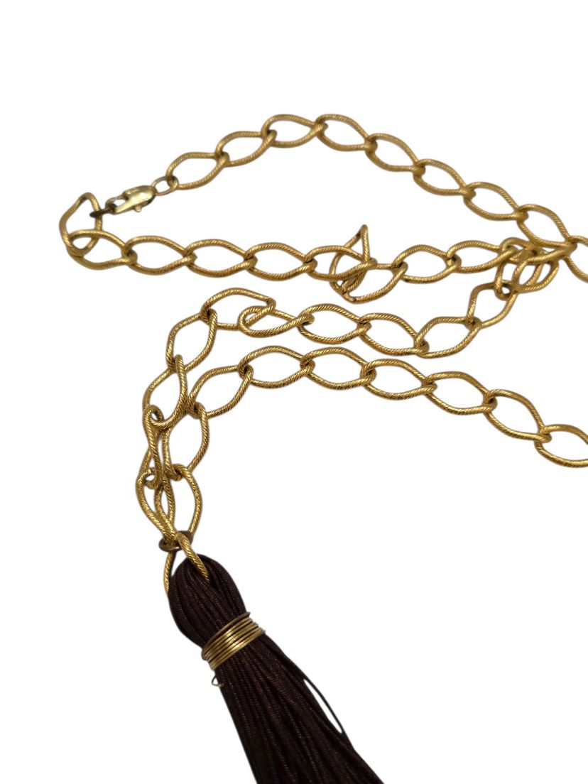 Vintage Signed Bee Charming NOS Brown Silk Cord Huge Tassel On Textured Link Chain Necklace (A9063)