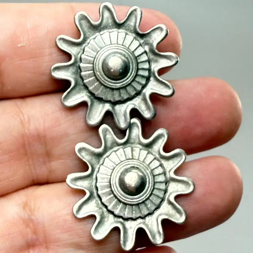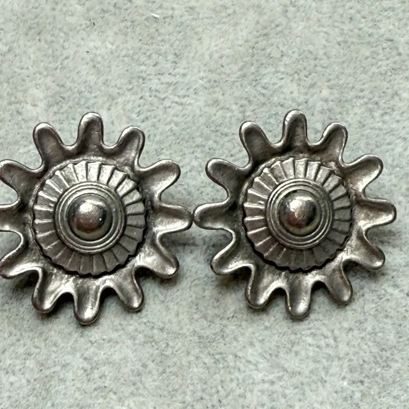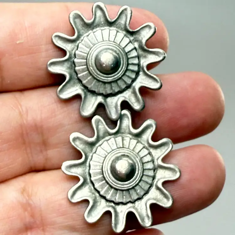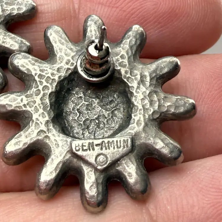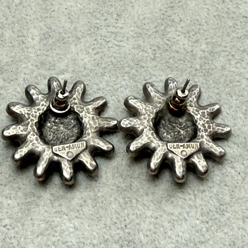 Vintage Signed Ben Amun Sun Starburst Gears Pewter Tone Pierced Earrings Silver Tone. Metal looks like pewter but not certain. 1" diameter. Great condition. Signed on back.