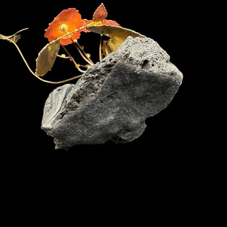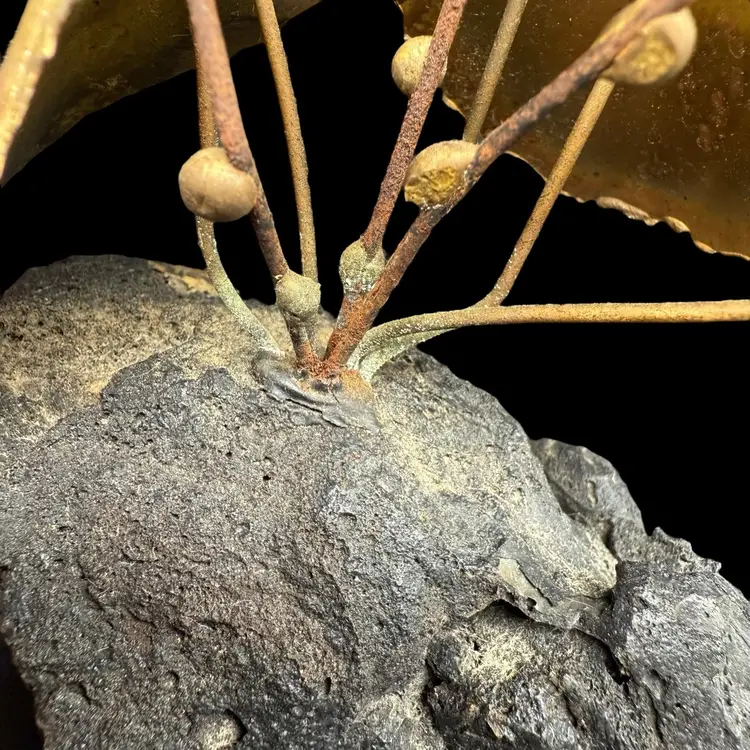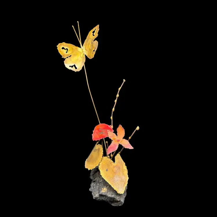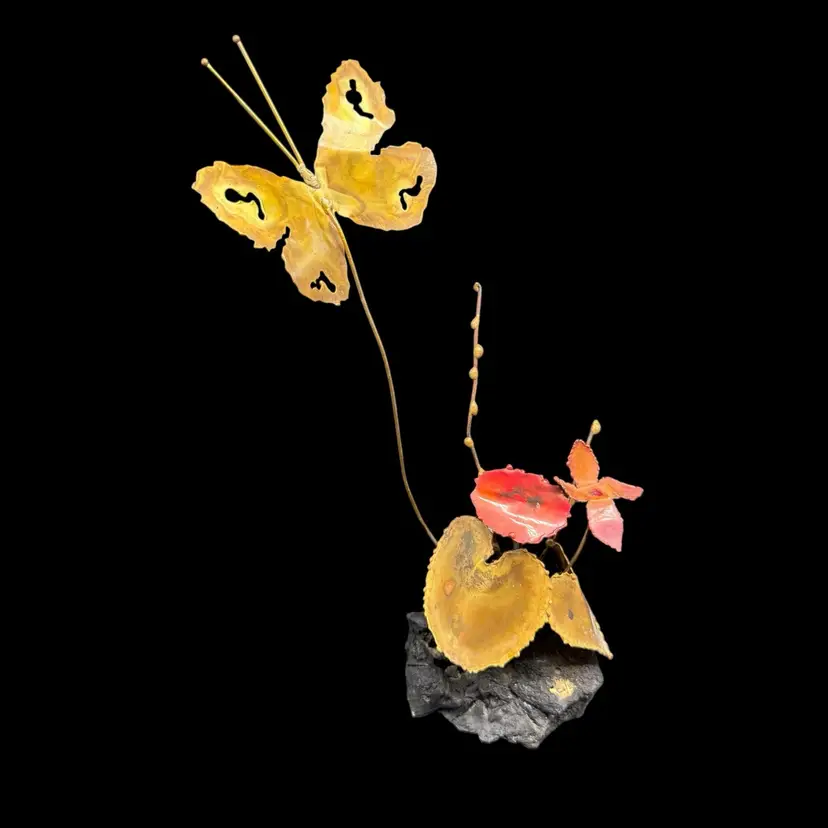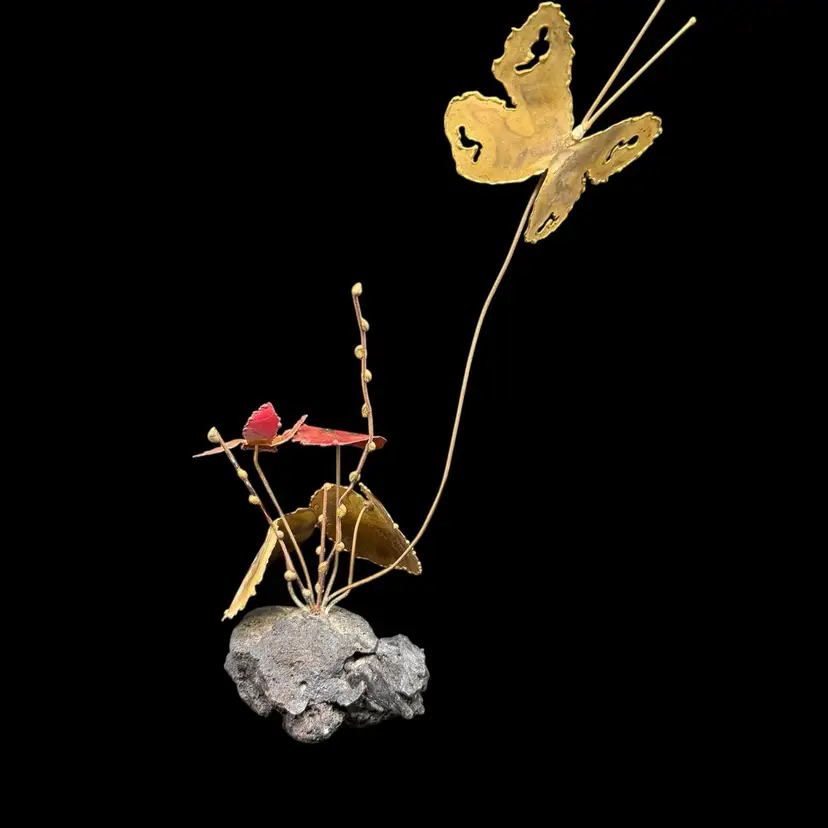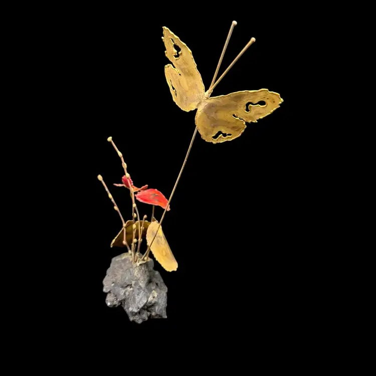 This vintage signed Cole metal art butterfly brass lava rock sculpture is a unique and handmade piece of American art. The sculpture features a small size with a height of about 15 inches, making it a striking statement piece for any art lover. The use of brass, metal, and rock materials in this sculpture reflects the artist's signature style, with a contemporary design that captures the essence of the 1970s. With its one-of-a-kind charm and original production technique, this sculpture is a rare find for collectors of art sculptures.