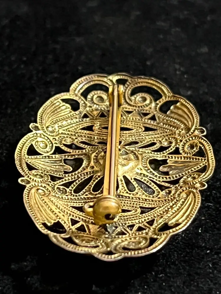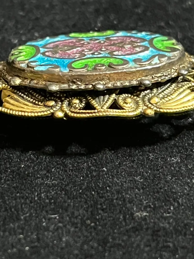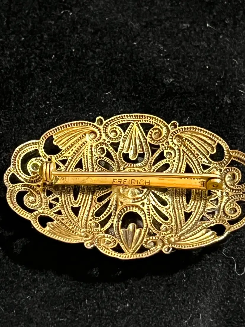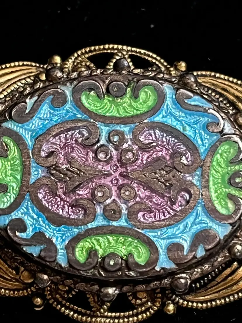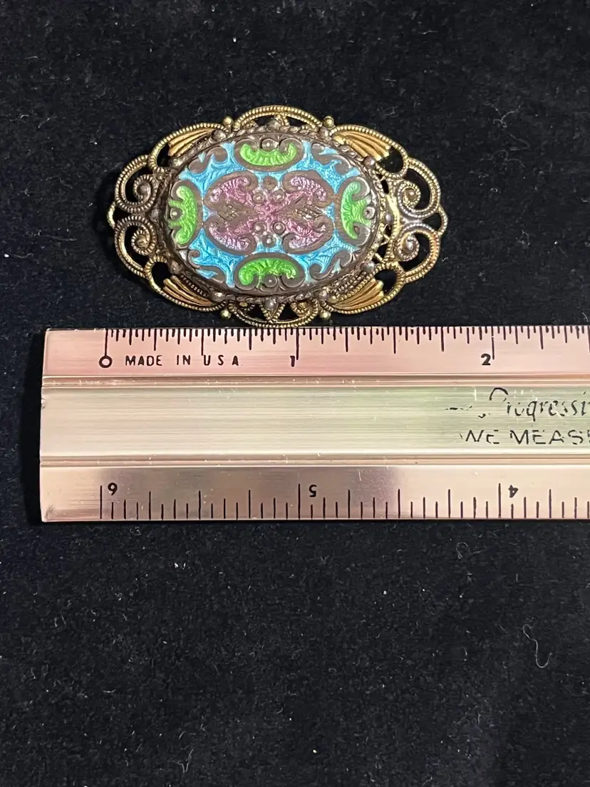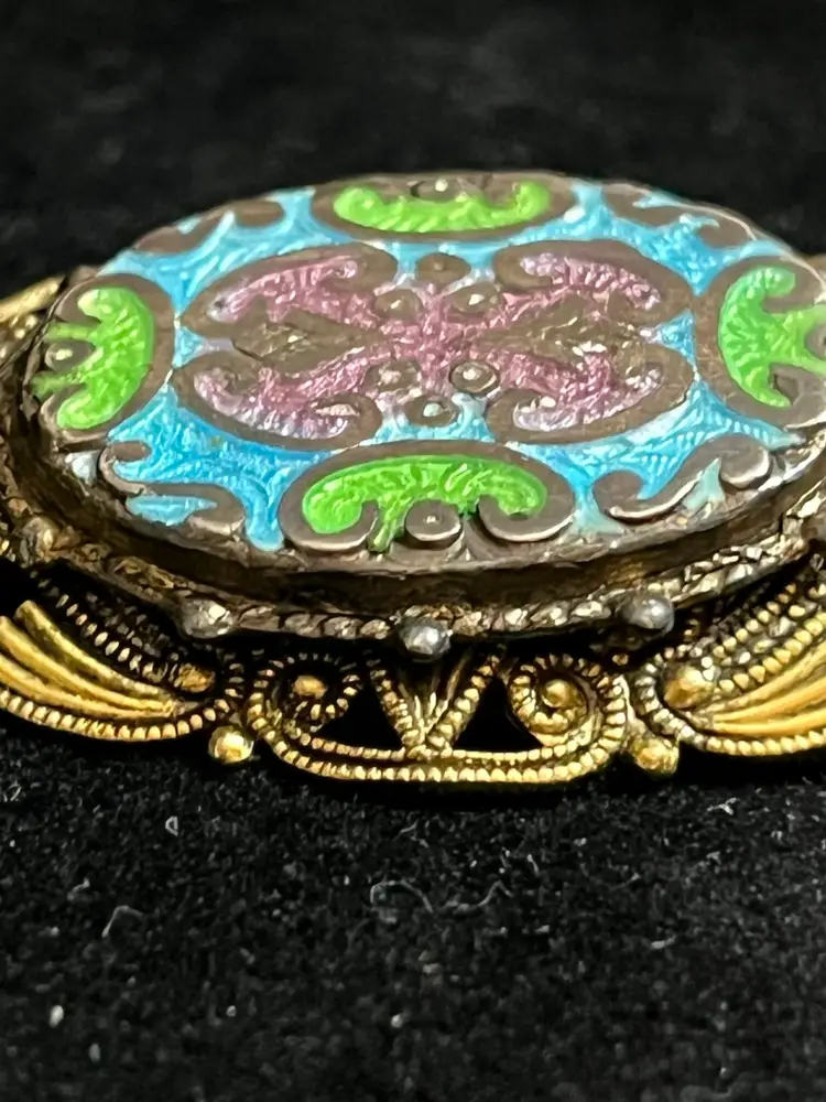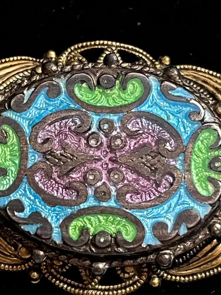 Maker: Signed "FREIRICH" on the pin stem. • Technique: Champlevé enamel in sky blue, apple green, and dusty mauve. • Style: Victorian Revival / French Filigree. • Condition: beautiful vintage patina