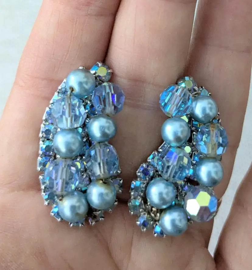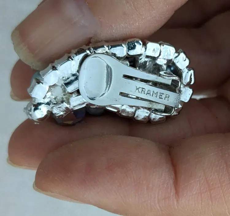 A wonderful combo of pearl, Aurora borealis rhinestones and crystal, 1-1/4" long, clip-on, marked Kramer