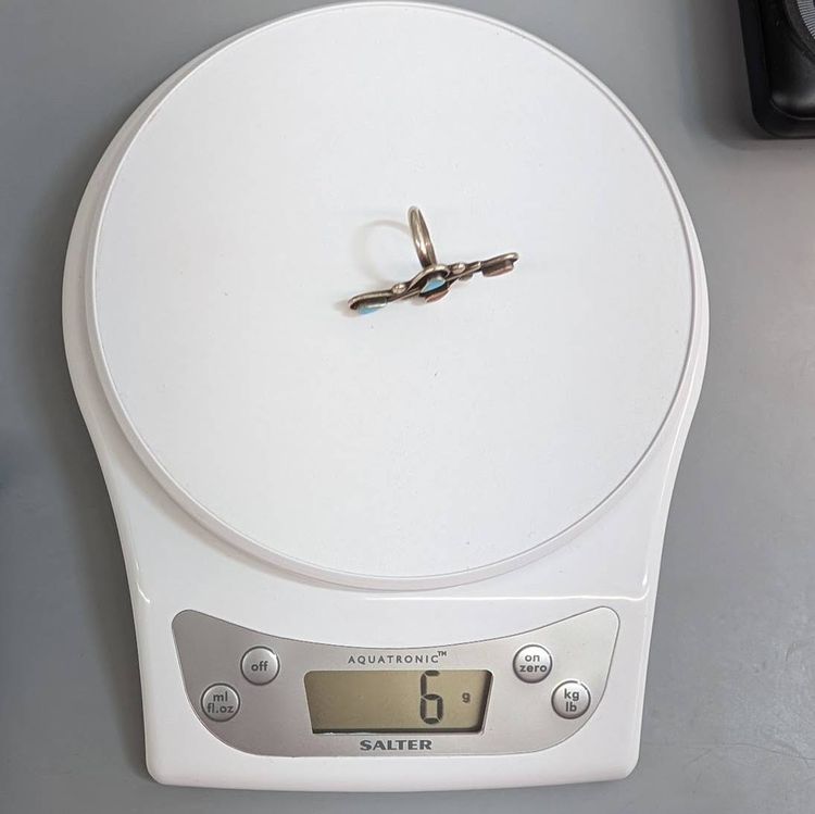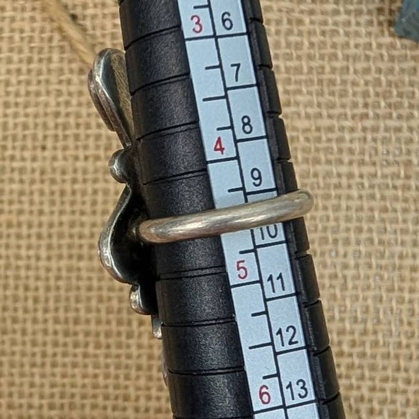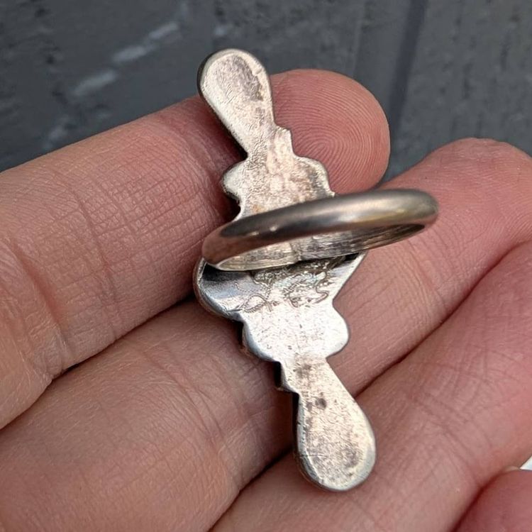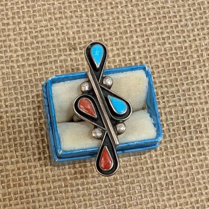 Long, sterling ring with turquoise and coral teardrop stones. Signed on the back what looks to read, "L. E.S." In nice, used condition. Size 4.5
