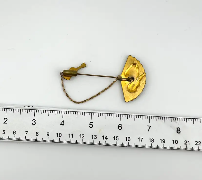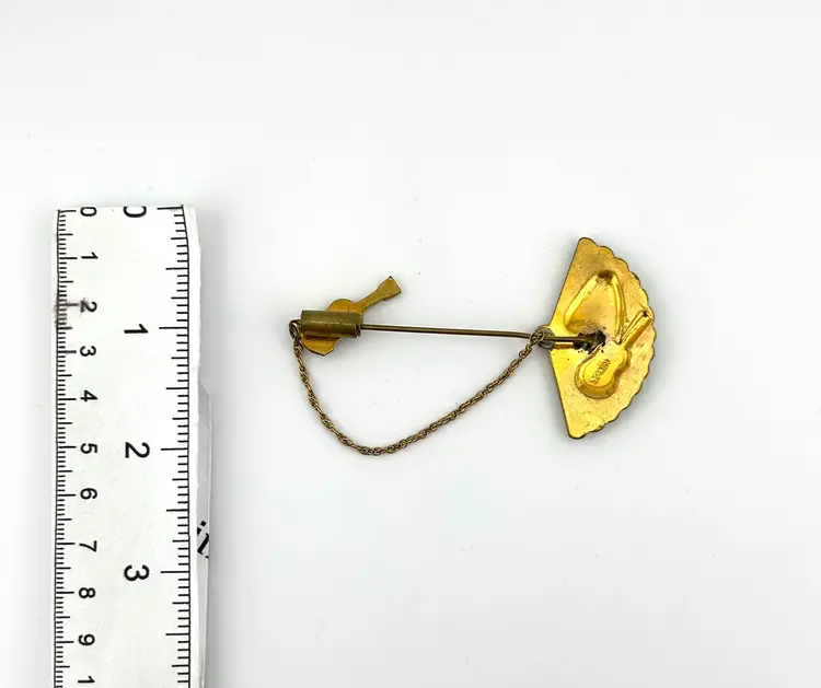 Enamel has a bit of wear due to age. Damascene jewelry is an ancient, intricate art form involving inlaying gold or silver threads into a blackened steel base to create detailed, often floral or geometric, patterns. Originating over 1,000 years ago in Damascus, Syria, it is now primarily produced in Toledo, Spain and Kyoto, Japan, creating high-contrast, luxurious, handmade pieces that are highly prized by collectors