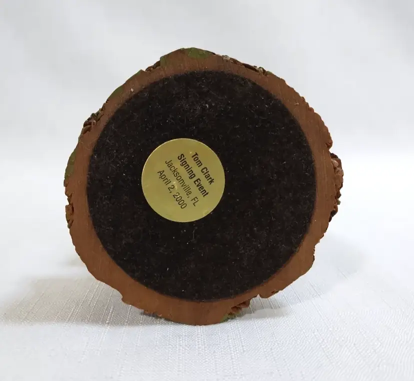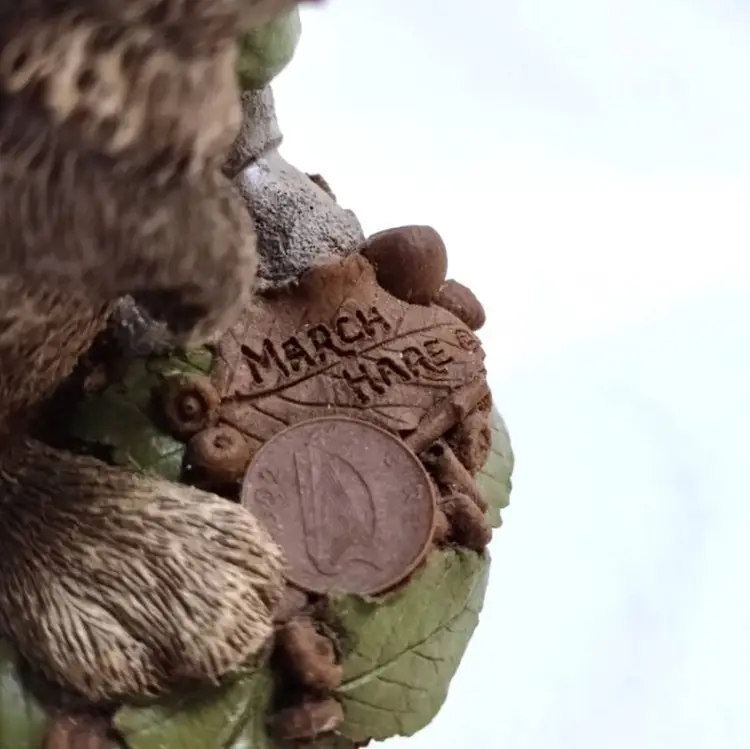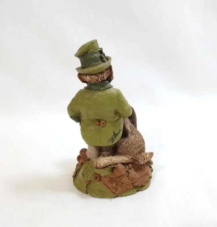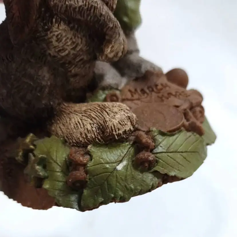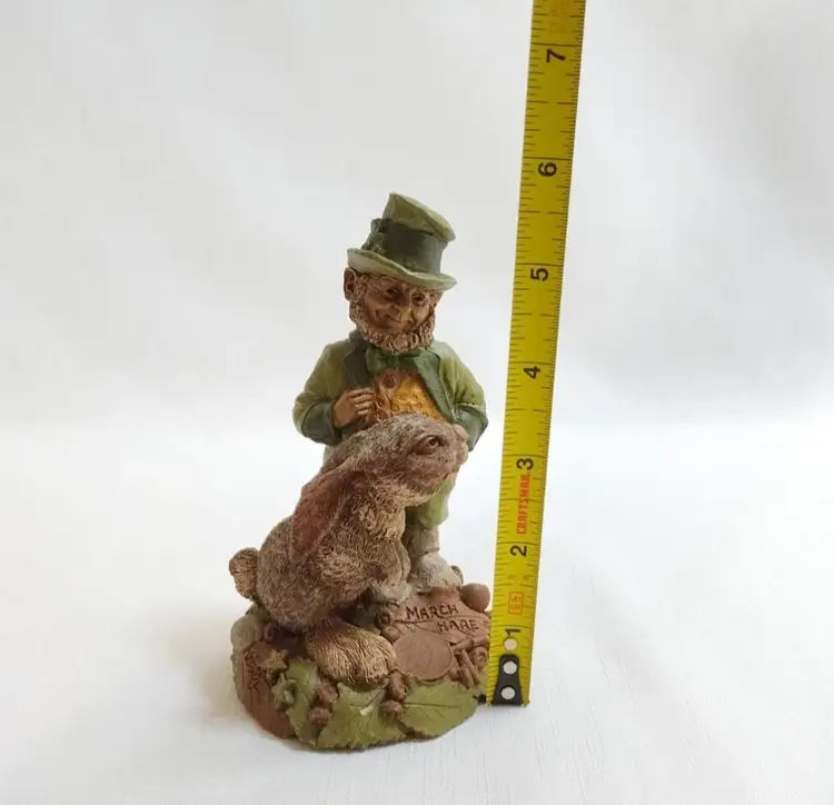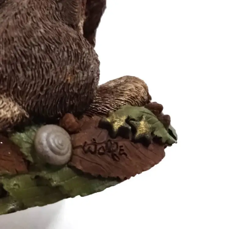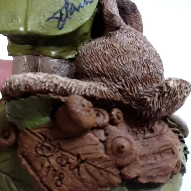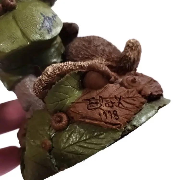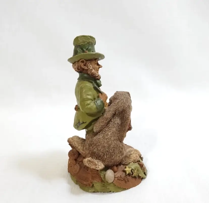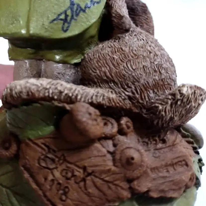 Fantastic Tom Clark and Wolfe figurine that not only has the normal incised signature but also has a hand signed marker signature from an exclusive signing event in Jackson FL in 2000. Measures approx 5.5 inches tall and 3.5 inches diameter at the base, features a gnome with a March Hare rabbit. Small area on front leaf with color loss, see images for details.