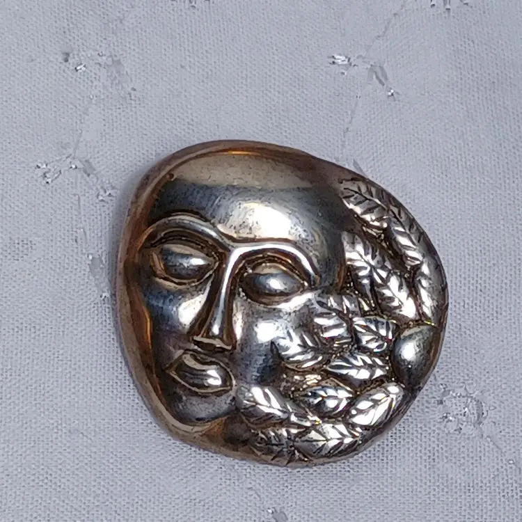 Add a unique touch to your collection with this vintage silver face brooch. Featuring intricate leaf details, this piece is perfect for any vintage jewelry lover. A true statement piece for any outfit. Marked 925 and signed Measures at 1 1/2"