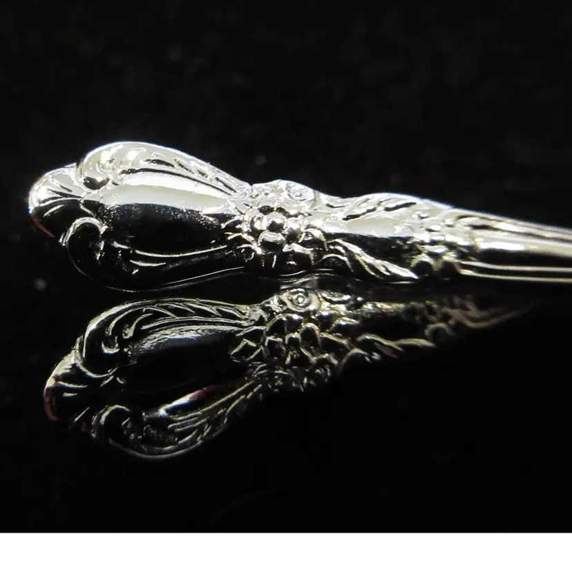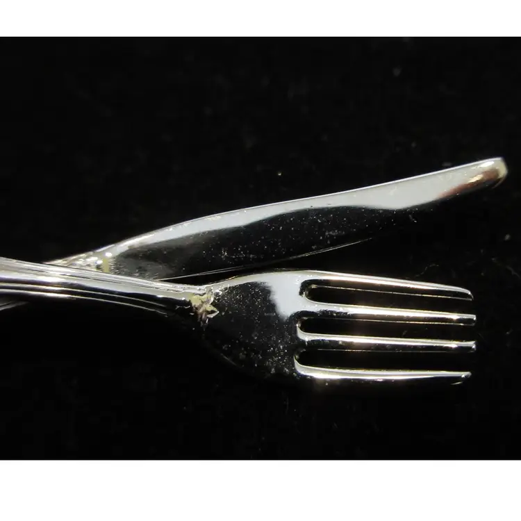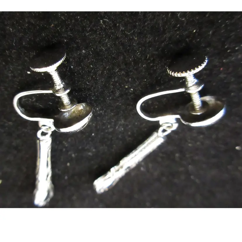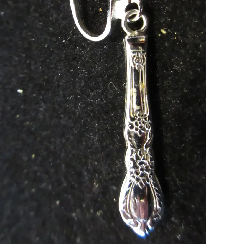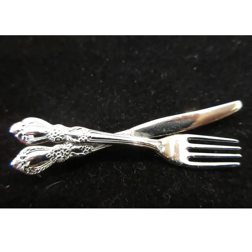 This is an ADORABLE set consisting of a silver tone metal brooch and screw back earrings. The brooch is shaped like a crossed knife and fork and the earrings are shaped like spoons. The brooch has a pin back with a sliding C closure and the earrings have screw backs. The brooch is about 2 inches long and the earrings dangle about 1.5 inches.