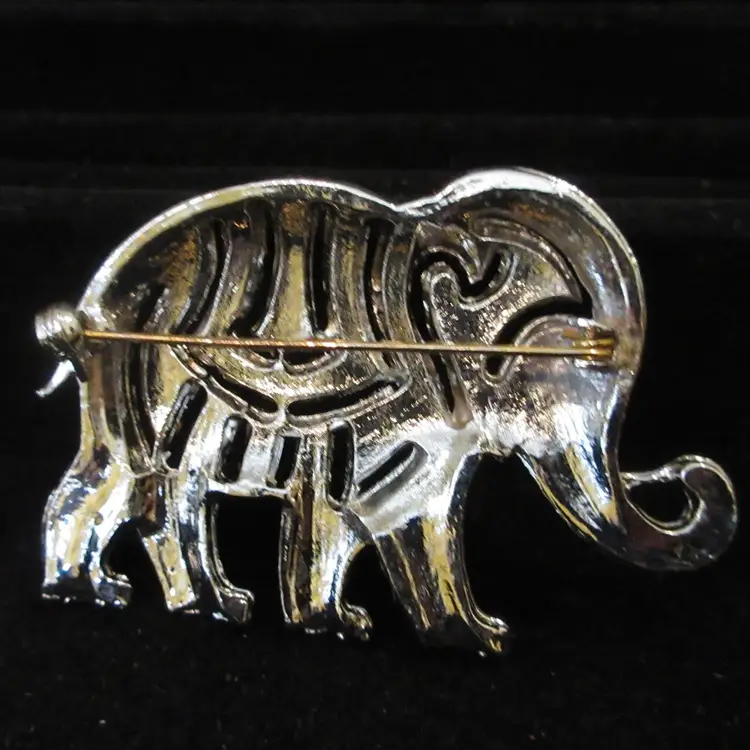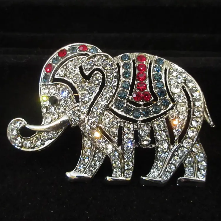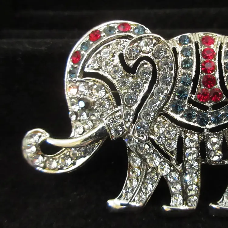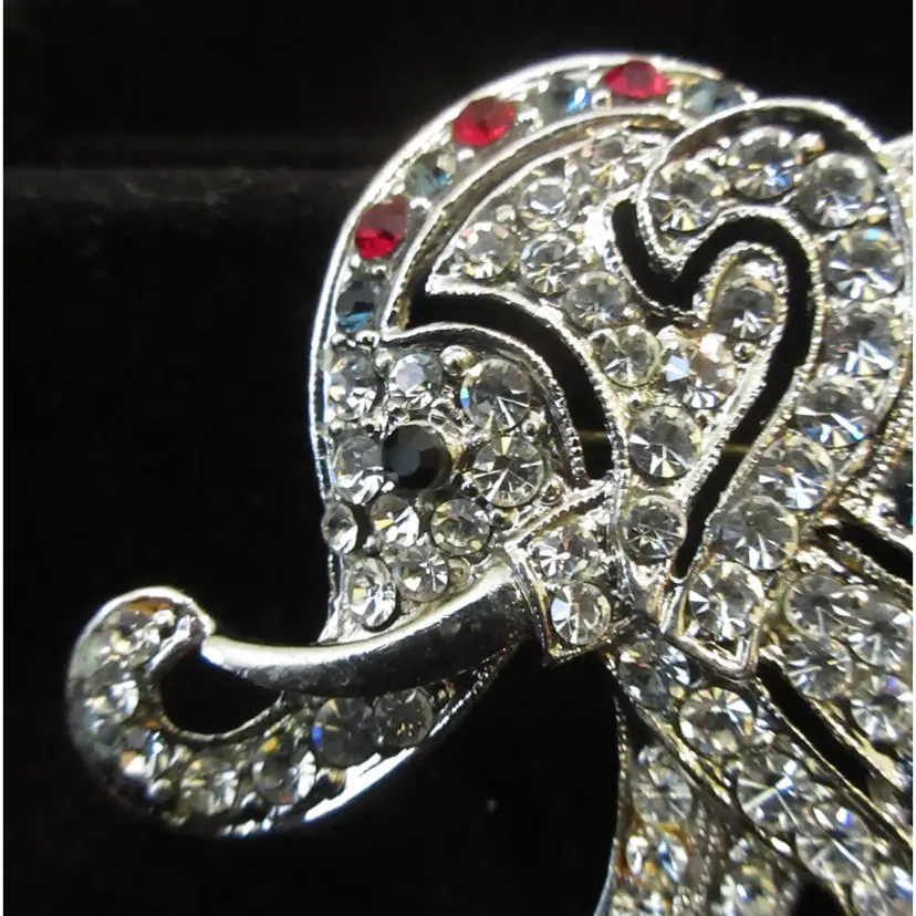 This is an AMAZING vintage silver tone metal brooch shaped like an elephant. The brooch is covered with crystal rhinestones in a pave setting. The blanket and headdress of the elephant are made of red and blue rhinestones and his eye is a blue rhinestone. This pin is bright and shiny. It is 2.5 inches long and 1.5 inches tall. It has a pin back with a sliding C closure.