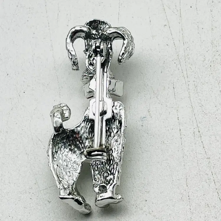 Charming vintage poodle brooch in textured silver tone metal, featuring a red enamel bow for a playful, elegant touch. Features: Detailed silver tone poodle design, 1.5 inch Red enamel bow accent Textured fur detailing Secure pin clasp Perfect for dog lovers and vintage jewelry collectors