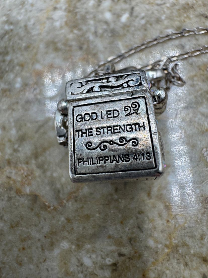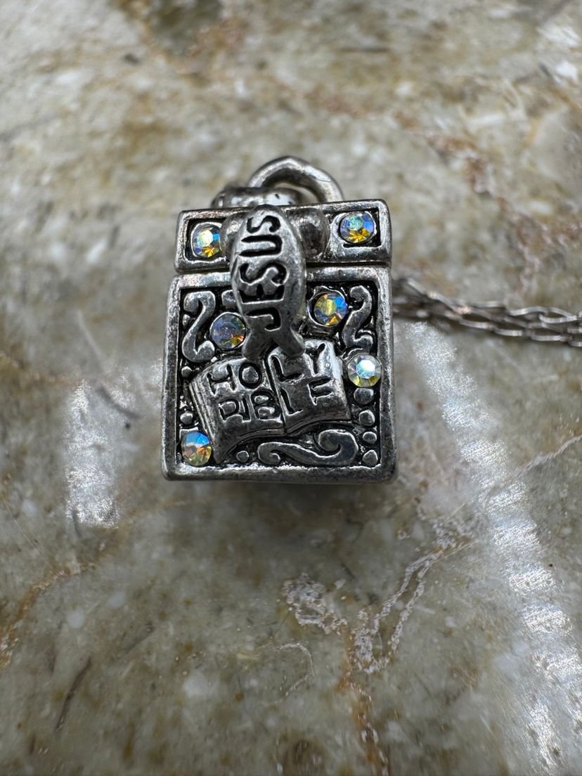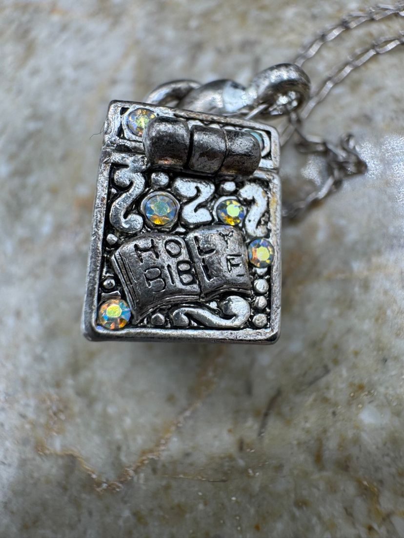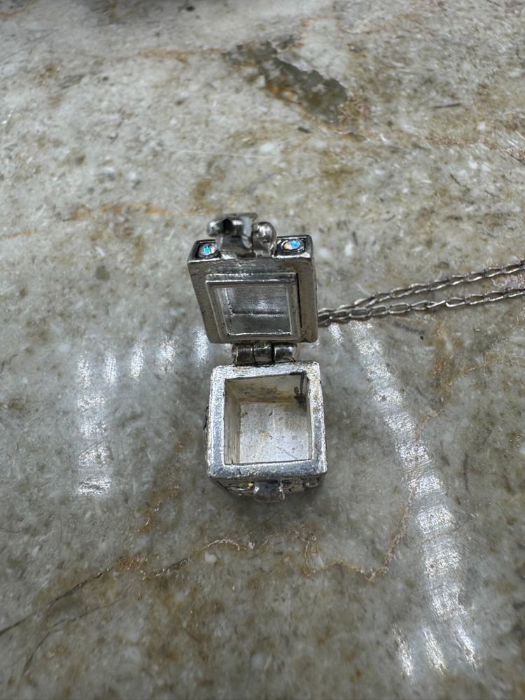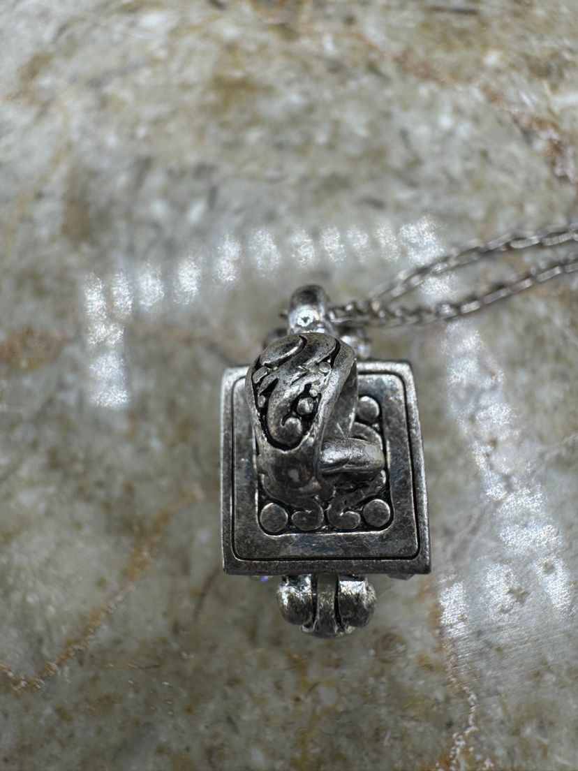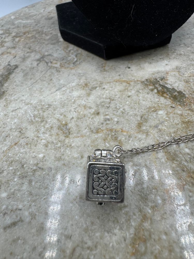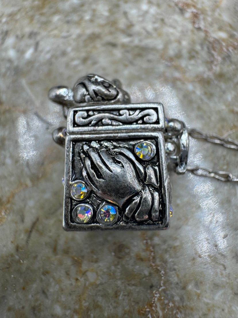 This amazing Vintage Silver Tone Prayer Box Pendant with AB rhinestones Necklace is 18” long and features a silver tone necklace. The pendant style necklace is vintage and has a unique design that will make a special addition to any jewelry collection. The prayer box pendant is a meaningful and stylish piece that is sure to be treasured for years to come. Excellent condition. Measures 18 inches in length