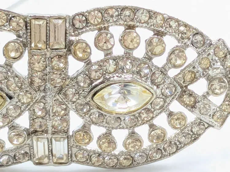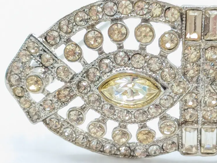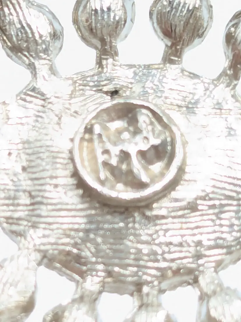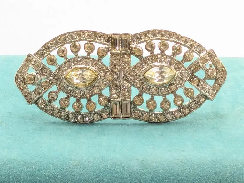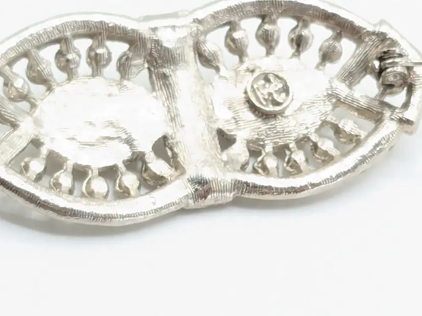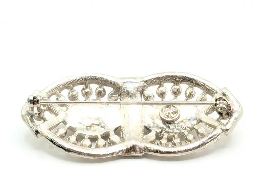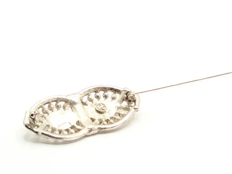 Good condition. This brooch is in the style of vintage/antique brooches. It does not open like the old duettes. Silver tone is bright and shiny with no color loss. Rhinestones are very sparkly and all present. Brooch is signed, Angel. An early QVC jewelry line. Measures 1" wide and 2 1/8" wide. EN3