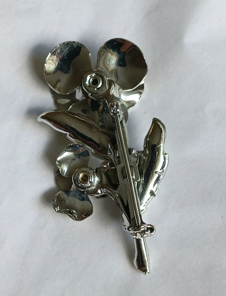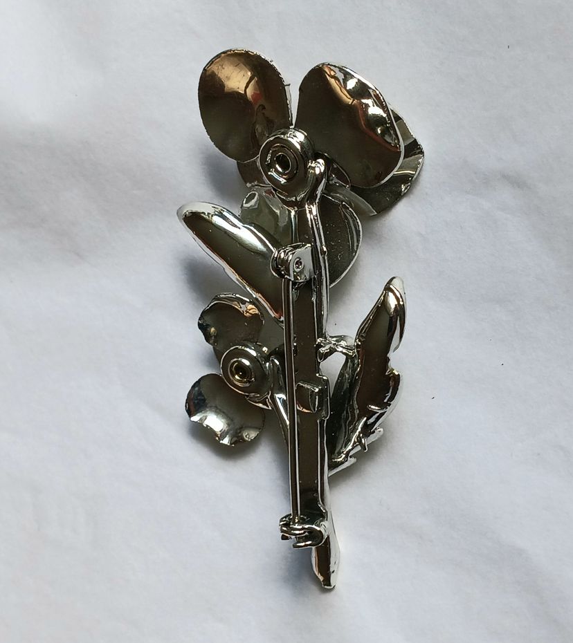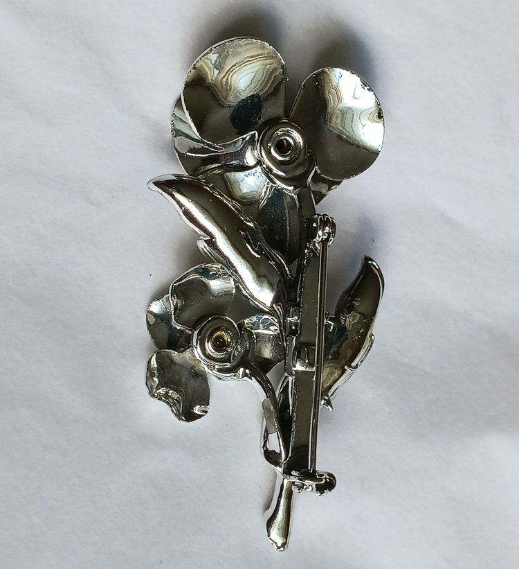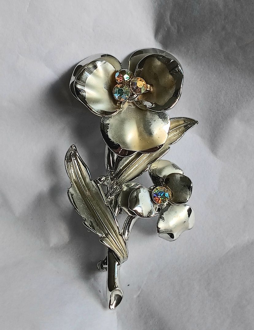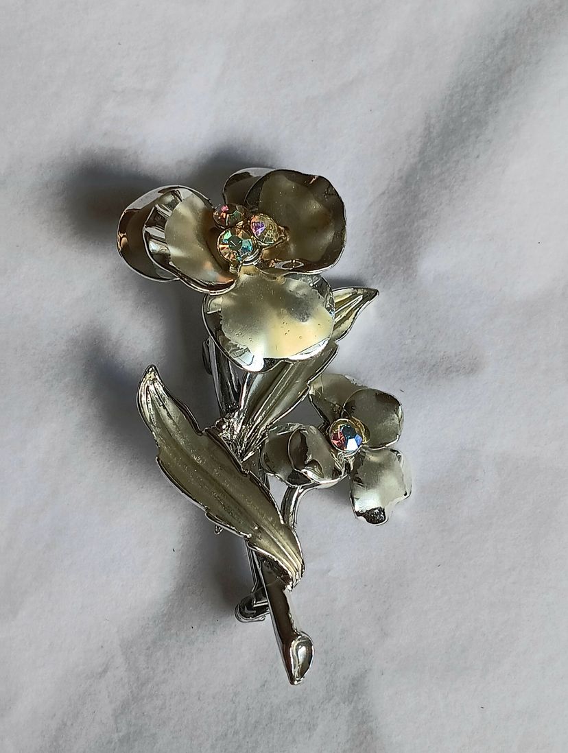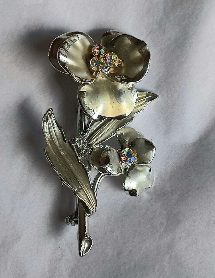 This is a vintage Coro flower bouquet brooch pin. It features a floral design with multiple blossoms and leaves in a silver-tone metal. The brooch is adorned with iridescent rhinestones in the center of the flowers, adding a touch of sparkle. These brooches are collectible pieces of costume jewelry from the mid-20th century.