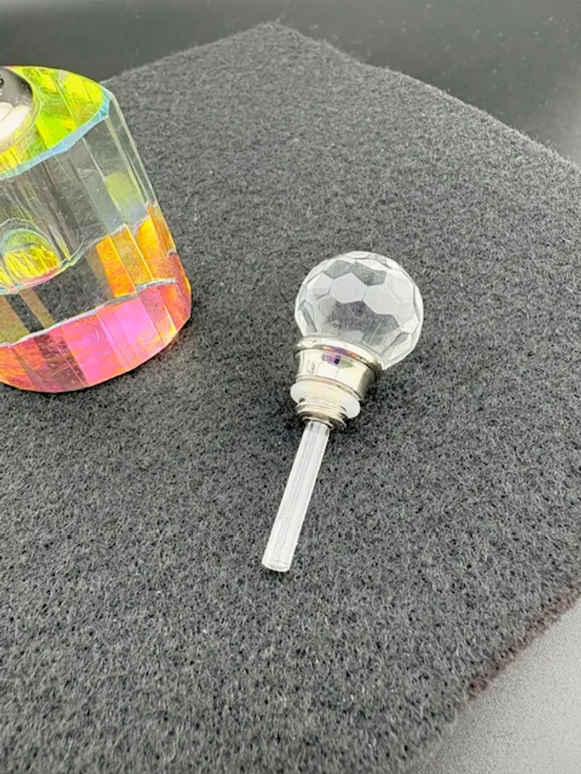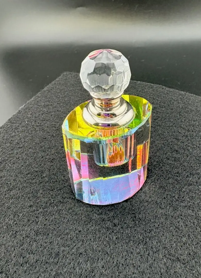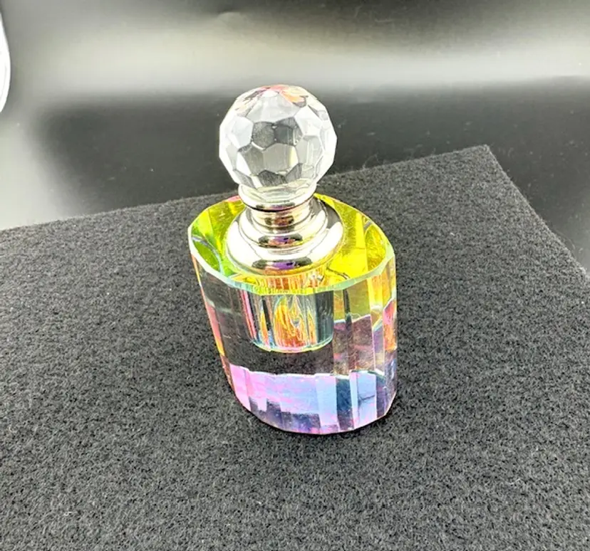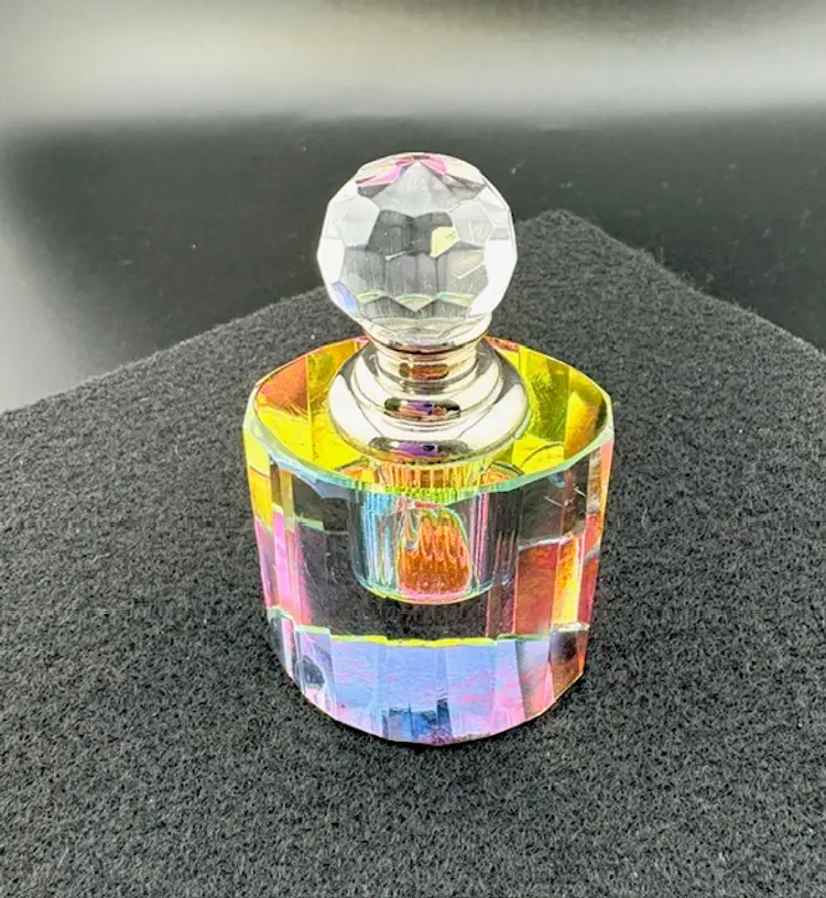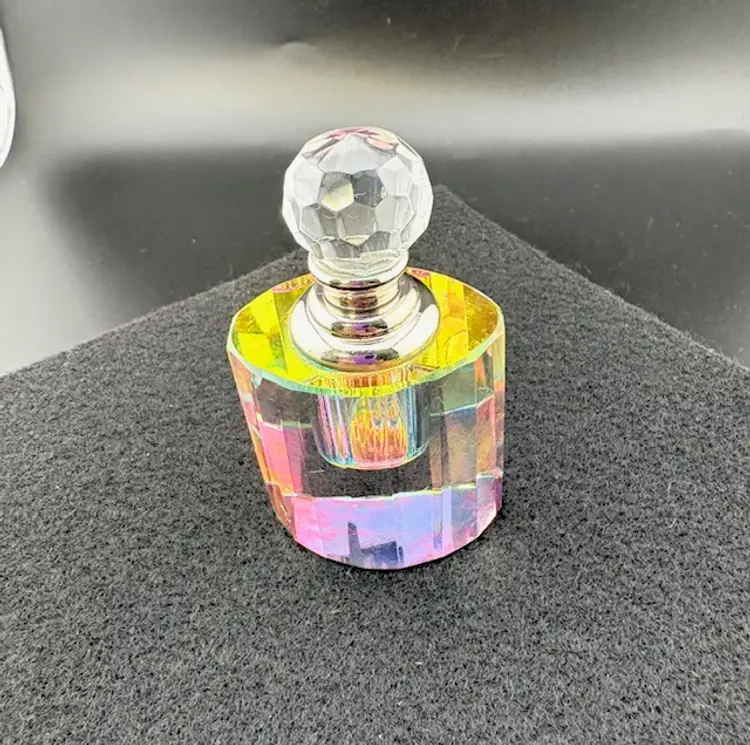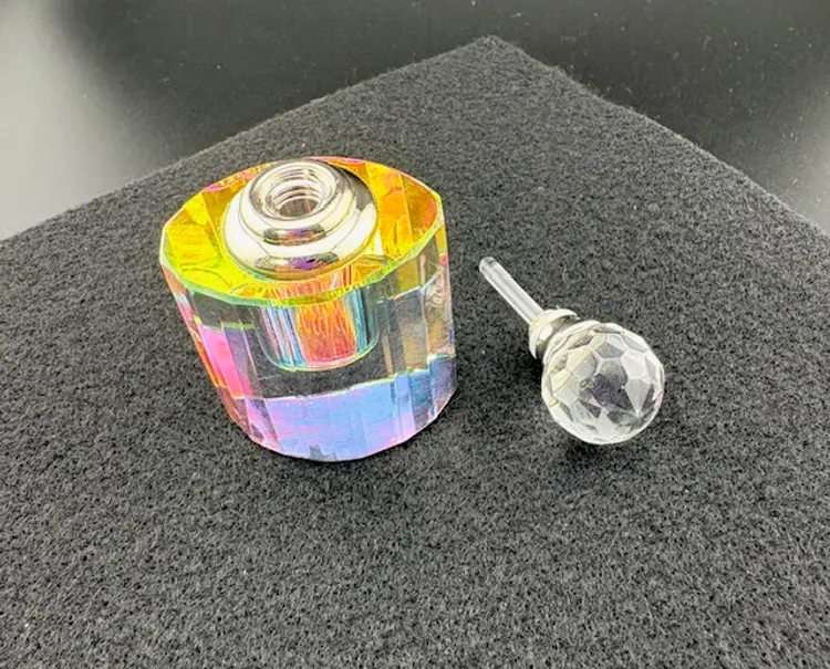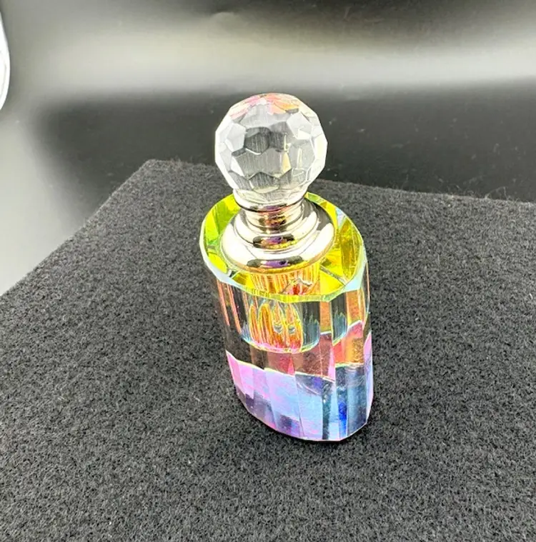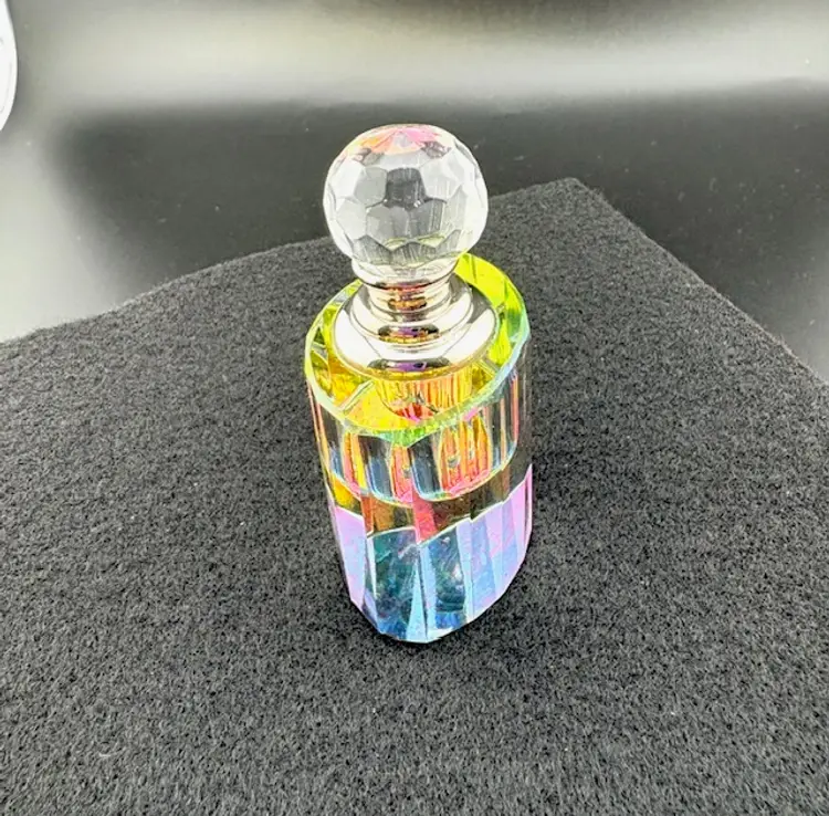 Beautiful perfume bottle with top that looks like a golf ball. The bottle really plays to the light around it and appears iridescent. There is felt on the bottom and it comes with a box. It is a screw on top and the dauber looks a bit askew. There are no chips or cracks.