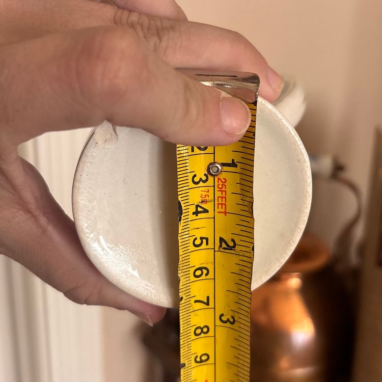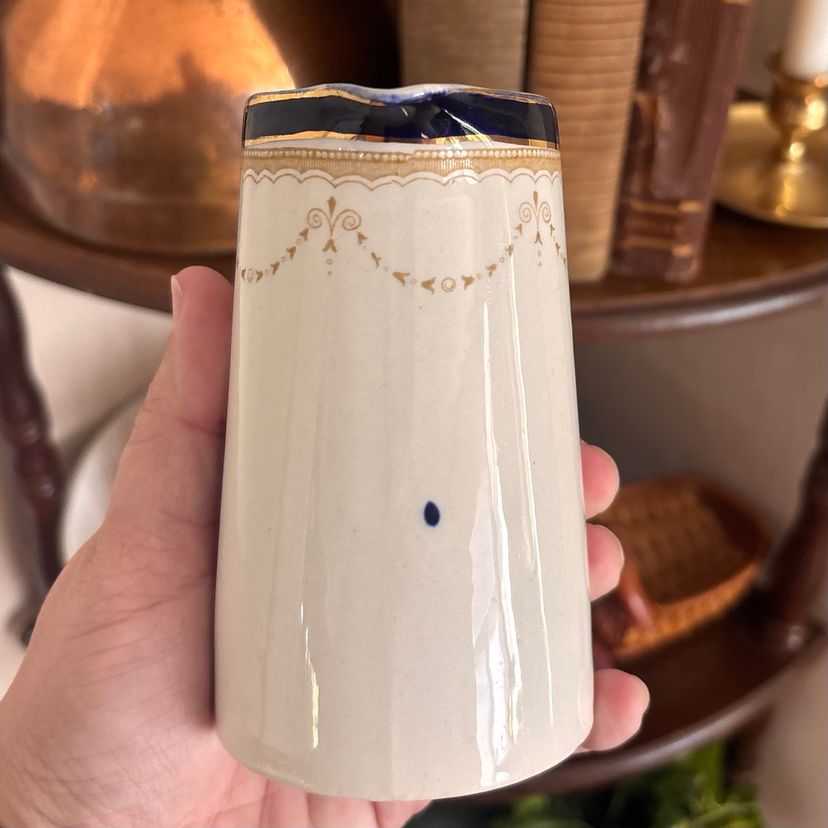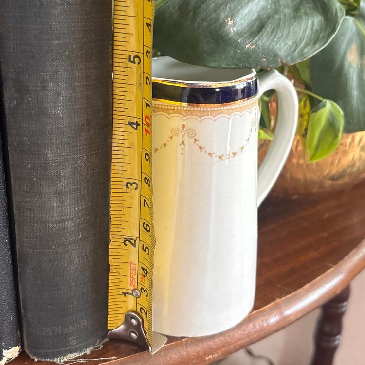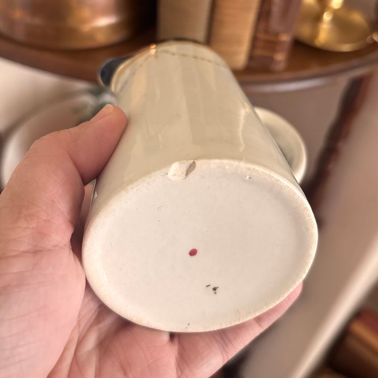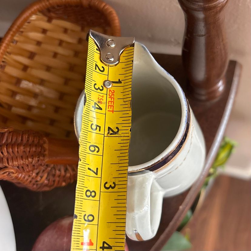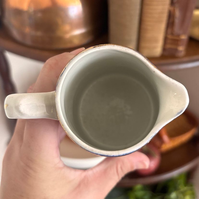 Petite vintage pitcher 5”tall x 4”wide including handle Vintage wear as shown- chip on bottom rim, blue dot part of manufacturing