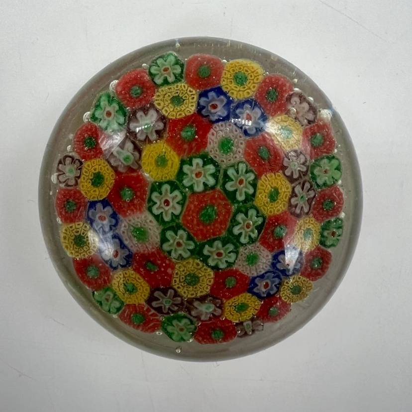 This vintage small Millefiori art glass paperweight measures 2.5 inches and features a red, yellow, blue, and green color scheme. Handmade in a Mid 20th Century production style, this decorative paperweight showcases a unique Millefiori pattern created through blown glass technique. The brand is unmarked, adding to its vintage appeal for collectors of decorative pottery and glassware. Excellent condition. No chips or cracks.