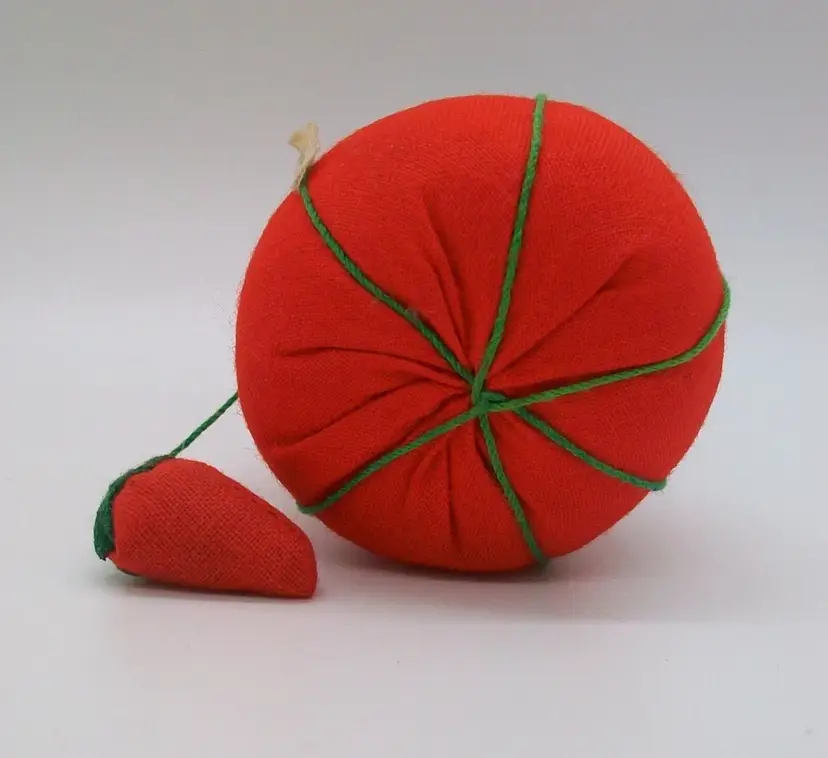 Small tomato shape strawberry needle minder measures 6.25" around, 2" tall, 2.25" across