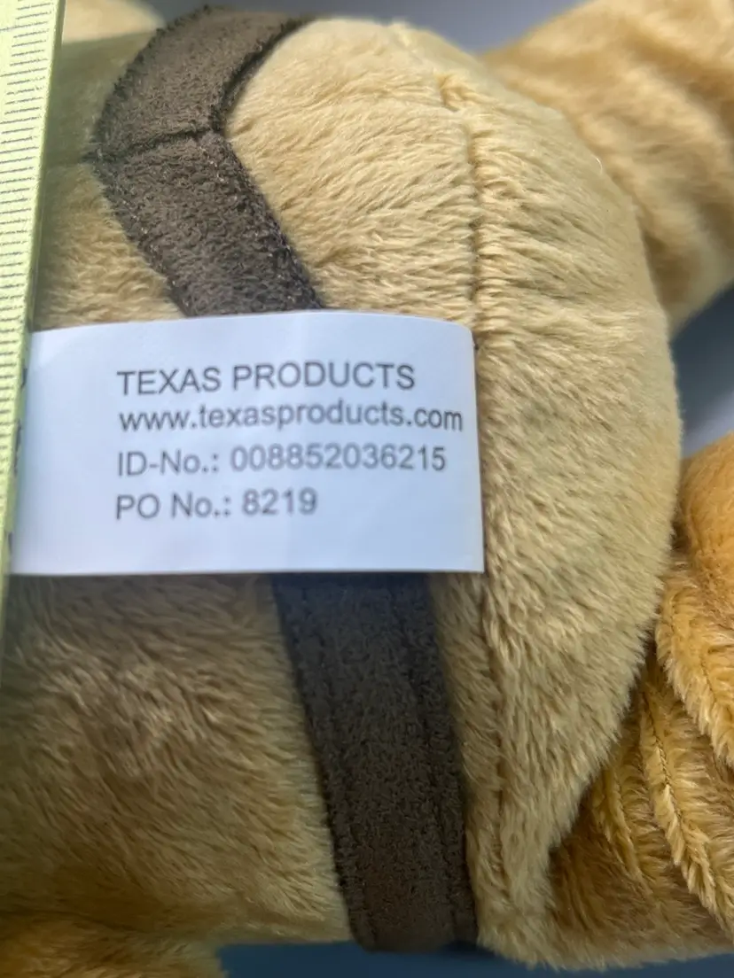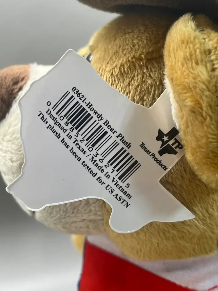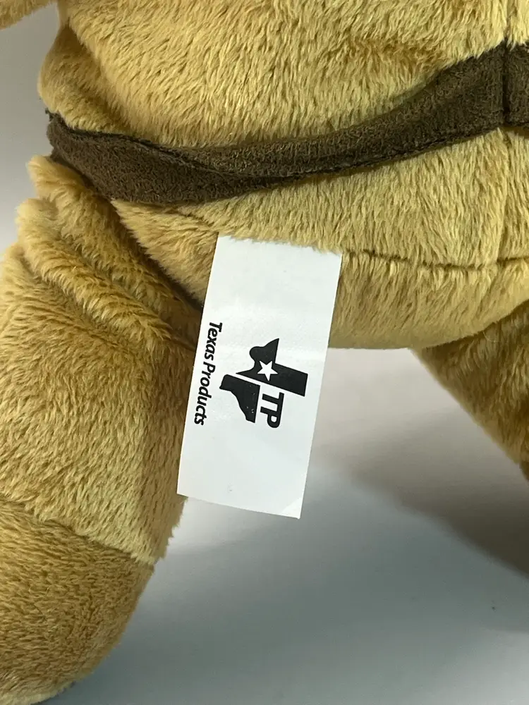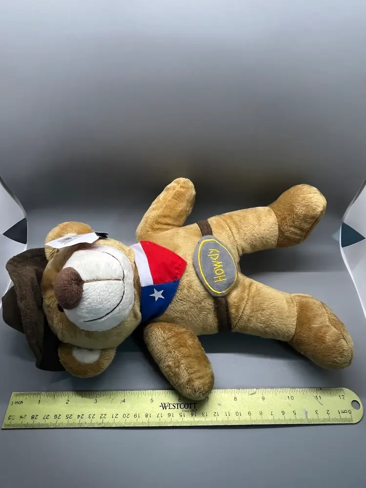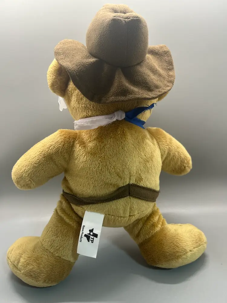 This item is a Texas-themed cowboy teddy bear plush. The stuffed animal wears a cowboy hat and a bandana featuring the Texas state flag. It also has a small fanny pack around its waist that says "Howdy".