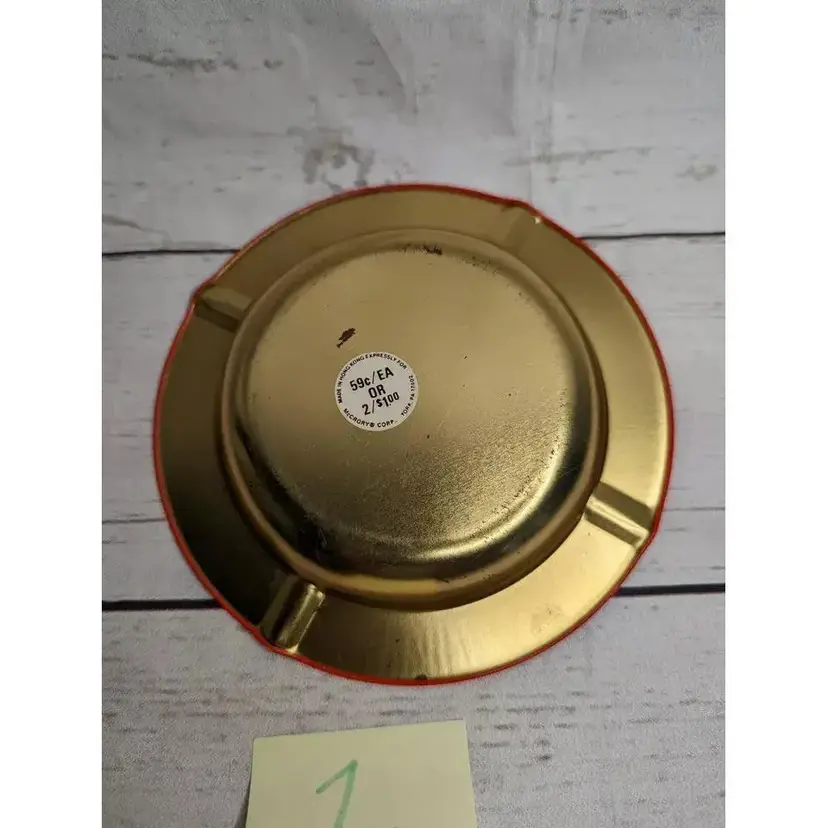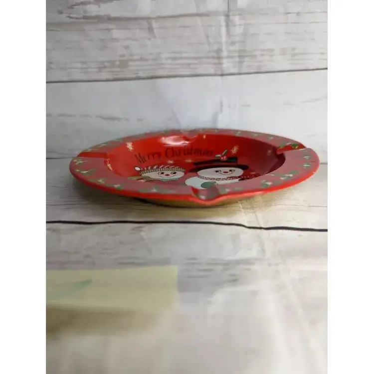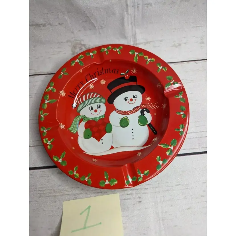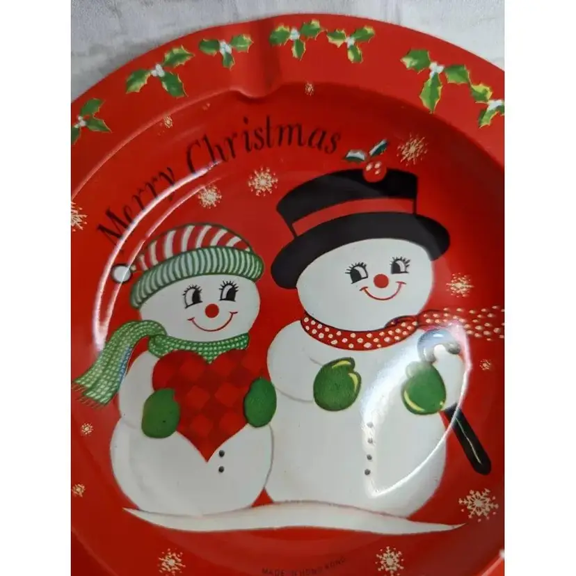 Vintage Snowman Merry Christmas Tin Ashtray - McCrory Corp - Made in Hong Kong - Measures Approximately 5.5" D and .50" H - Minimal Wear - Good Condition