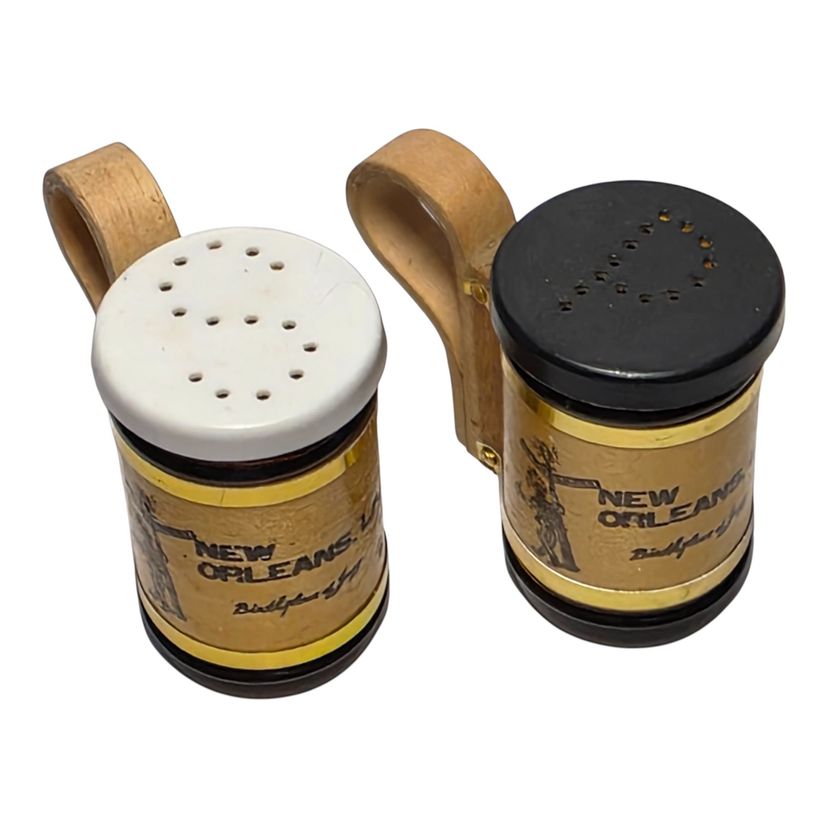 Add a touch of nostalgia to your dining table with these vintage New Orleans souvenir salt and pepper shakers, shaped like charming brown glass beer barrels. Perfect for collectors or as a unique gift.