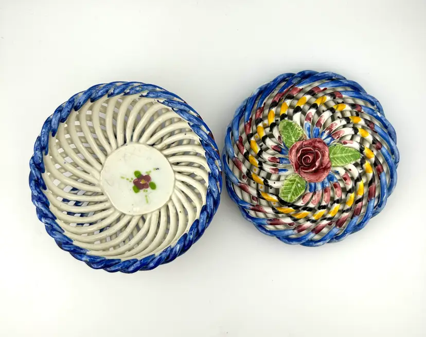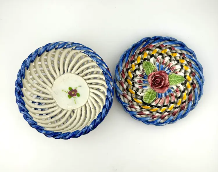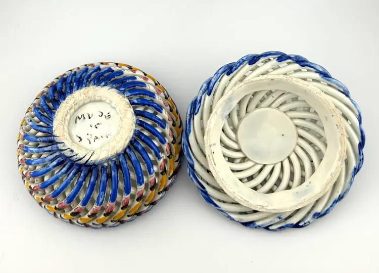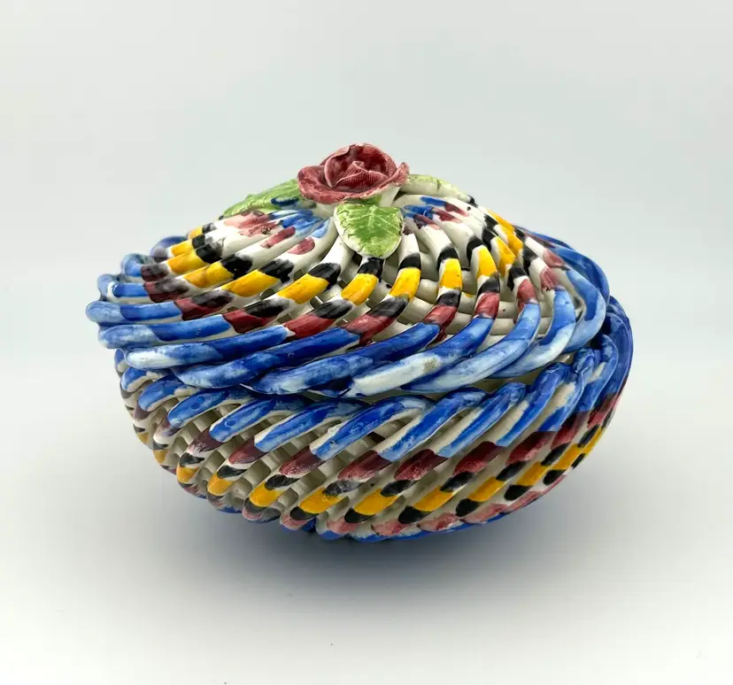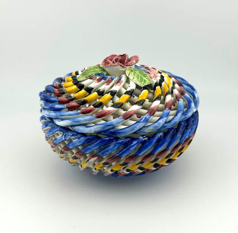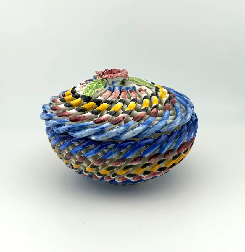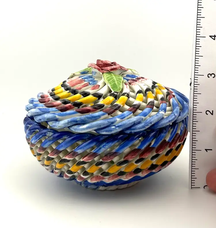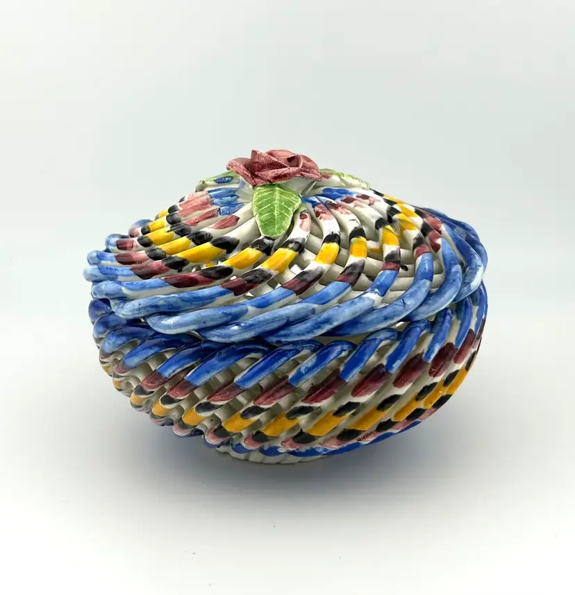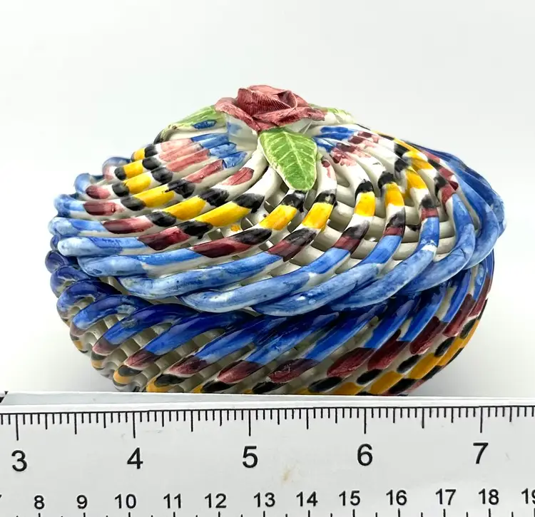 Vintage Spanish Hand Painted Woven Basket Ceramic Lidded Dish 4”x 3.5”